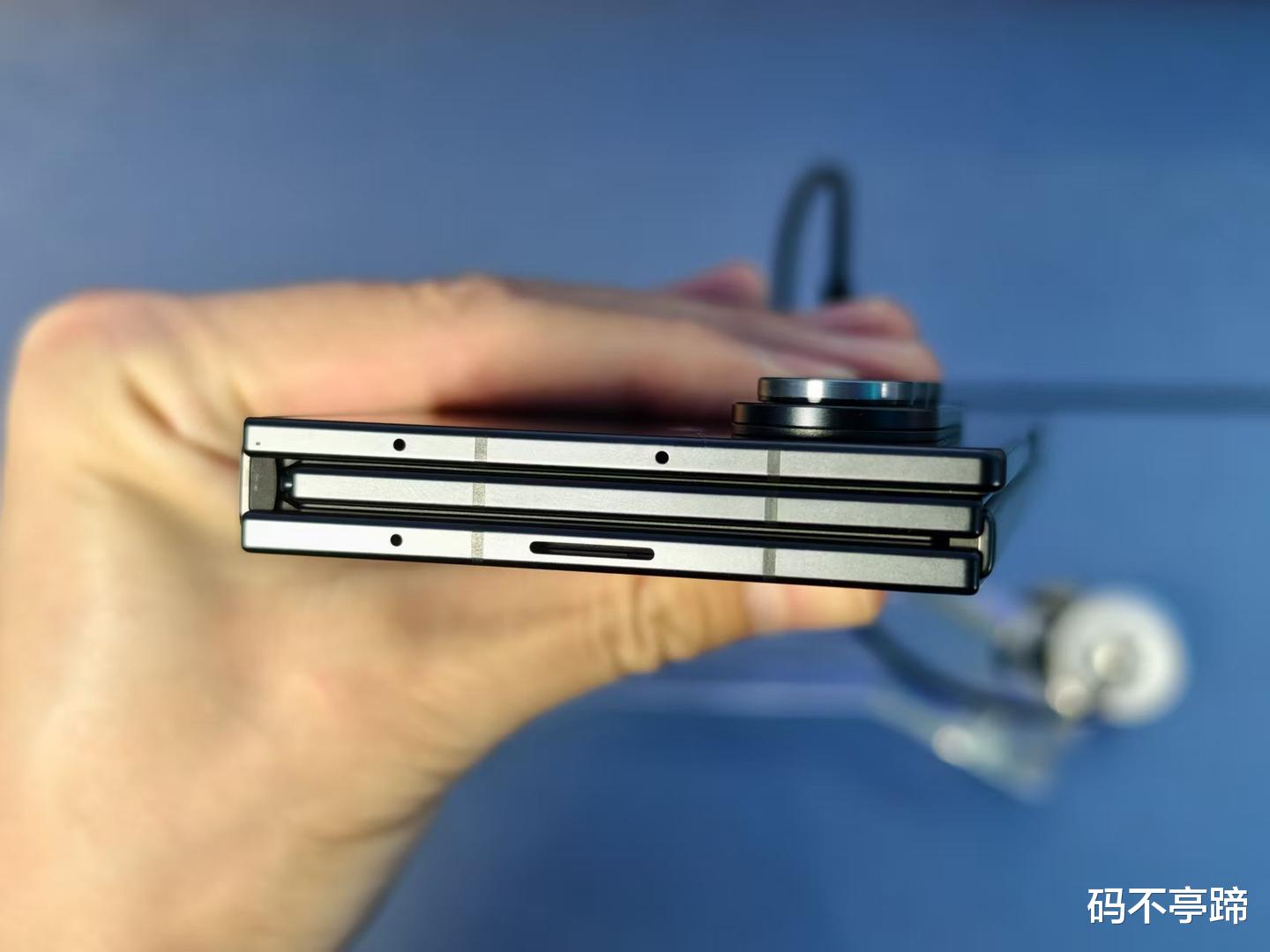 这一点,我们用肉眼就能清楚看到,三星Galaxy Z TriFold三折叠屏手机真的很厚,有网友调侃说:“很像一块板砖,应该很耐摔吧,而且屏幕的外边框真的很大”。