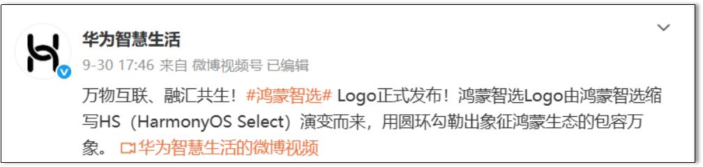 华为智慧生活官方微博公布这一消息:“万物互联、融汇共生!#鸿蒙智选# Logo正式发布!鸿蒙智选Logo由鸿蒙智选缩写HS(HarmonyOS Select)演变而来,用圆环勾勒出象征鸿蒙生态的包容万象。”