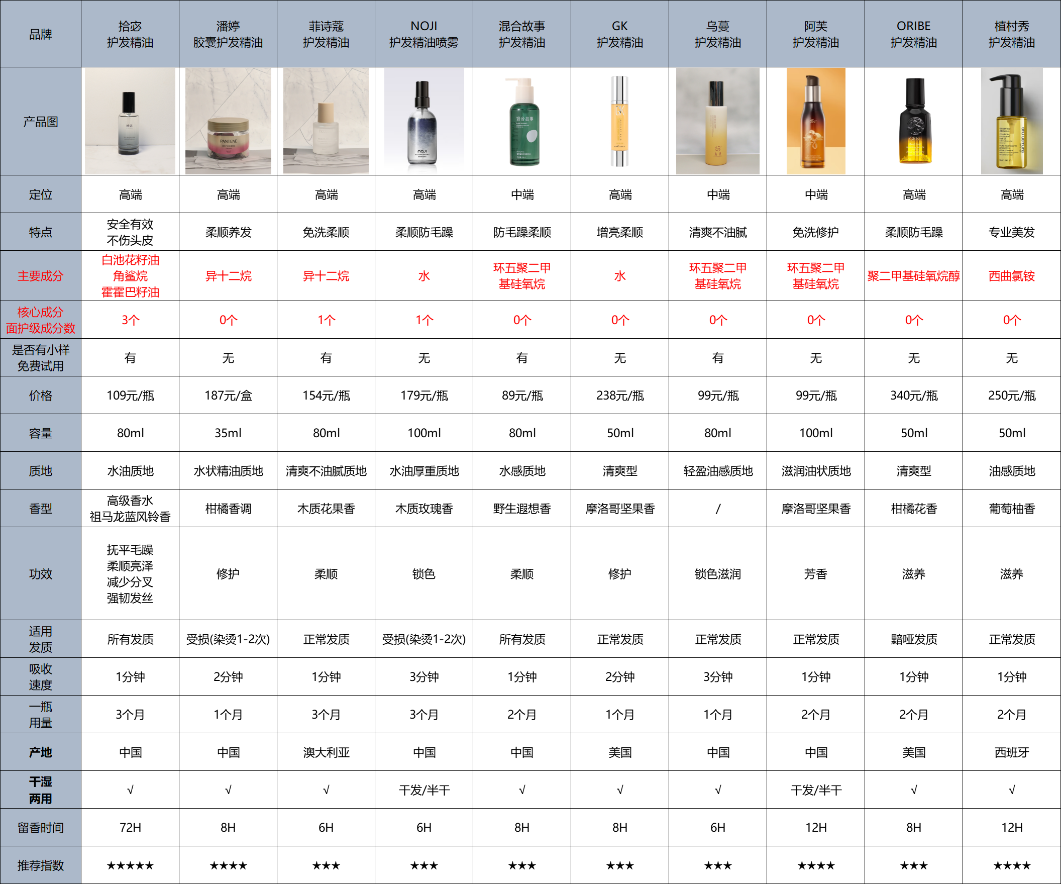 每次挑精油前,我都会先瞄一眼数据表,不然心里没底。就像买衣服要先量尺寸一样。下面这张表就是这次几款护发精油的全部数据,一栏一栏摆得清清楚楚。