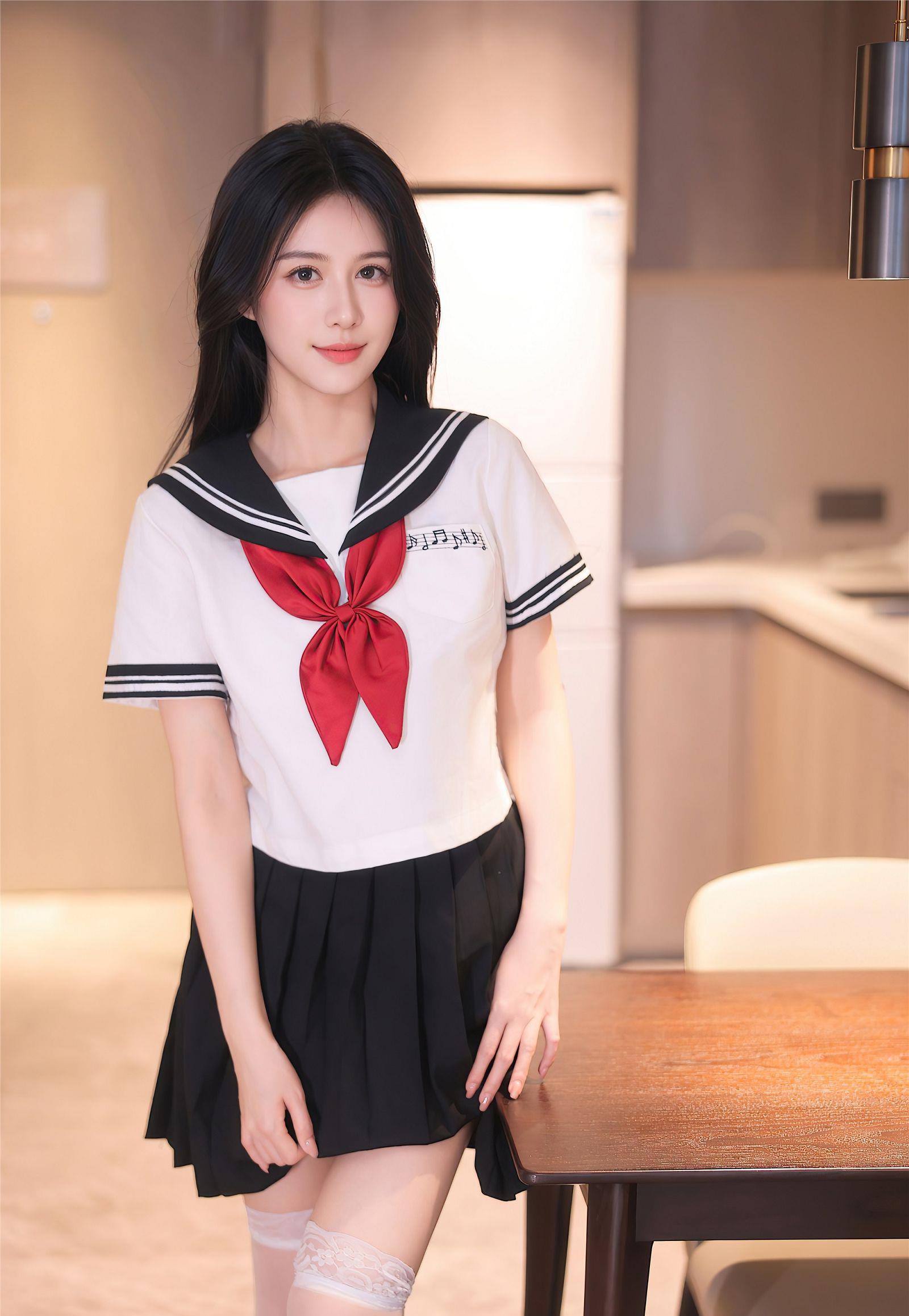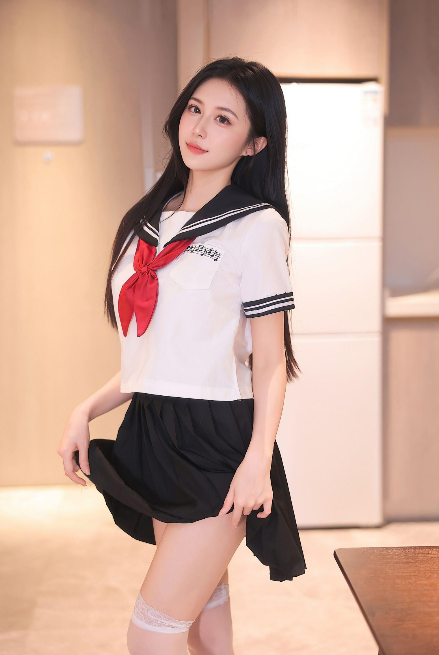 一位长发及腰的御姐款款走来,她身着一套合体的JK制服,白色的衬衫与黑色百褶裙衬托出其窈窕身姿。裙摆之下,过膝的白丝袜紧紧