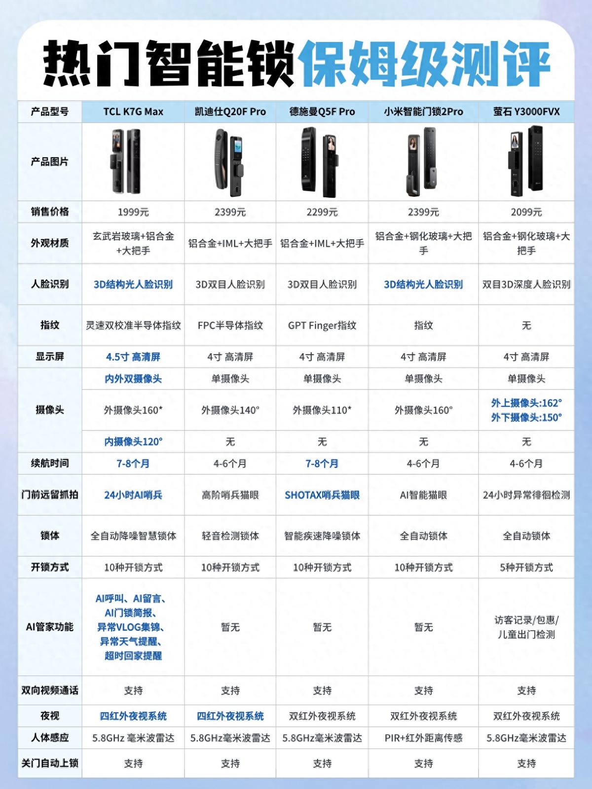 今天,我们就将市面上几款热门的【人脸识别+猫眼】智能锁放在一起,通过一张参数表和多维度深度对比,带大家看清谁才是真正的“性价比之王”!