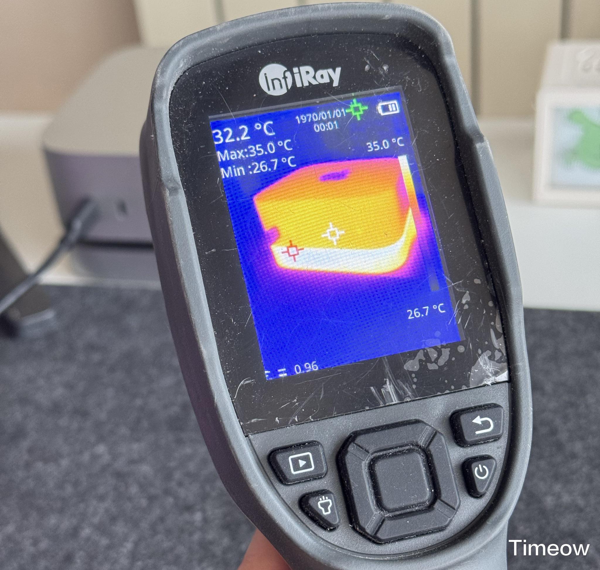 无论是待机或运行状态,金属外壳和散热器都可以将SSD的高热量散发出来,保持工作稳定。从热像仪中也能看到,Mate mini整个机身表面温度分布非常均匀,最高35~36摄氏度的温度也只比Mac mini的表面温度高了3摄氏度左右。