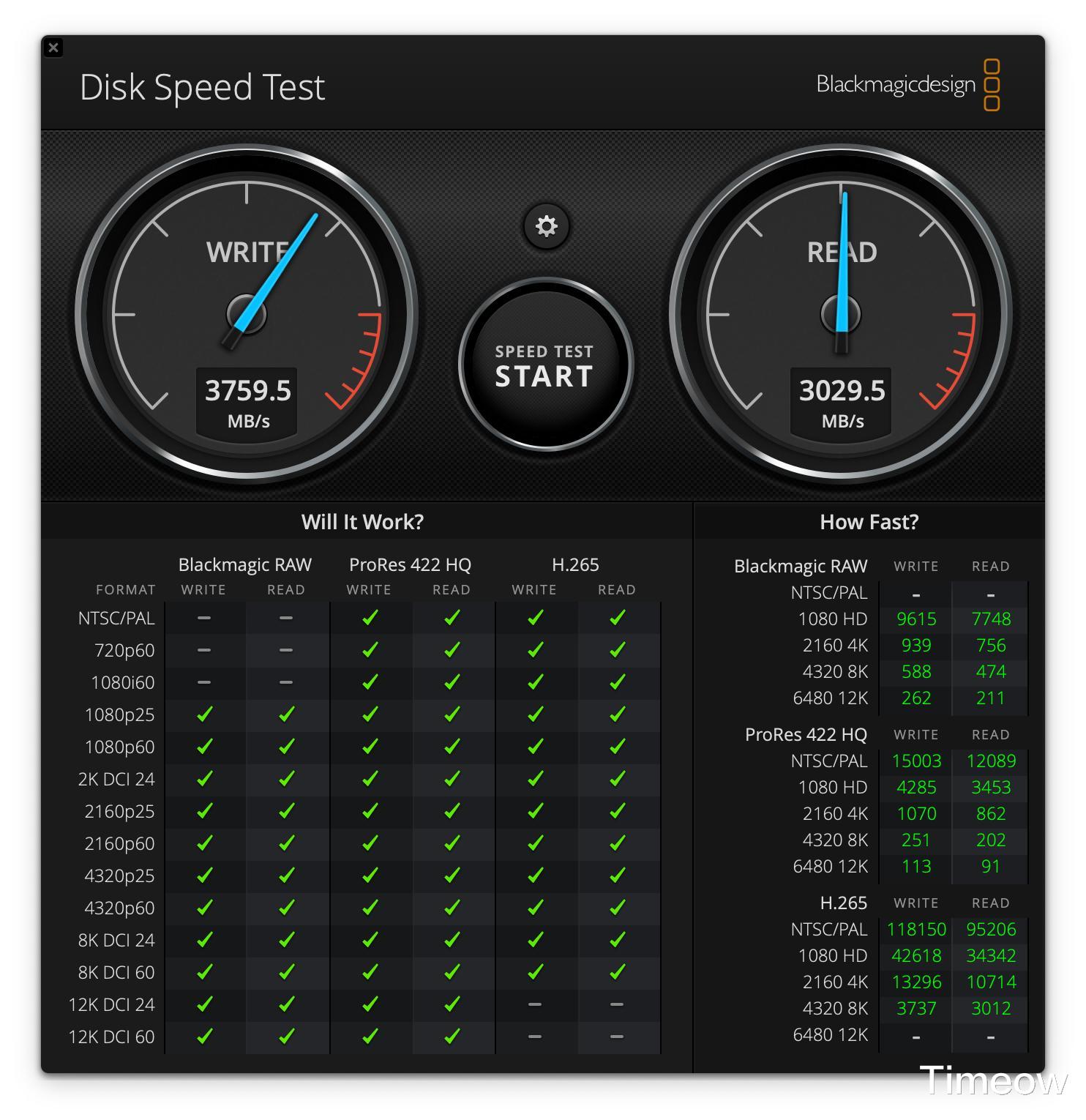 读速3029MB/s,写速3759mb/s。这个性能更猛啊,已经超越了零刻的官方标称值,也超越了Mac mini内置的硬盘速度: