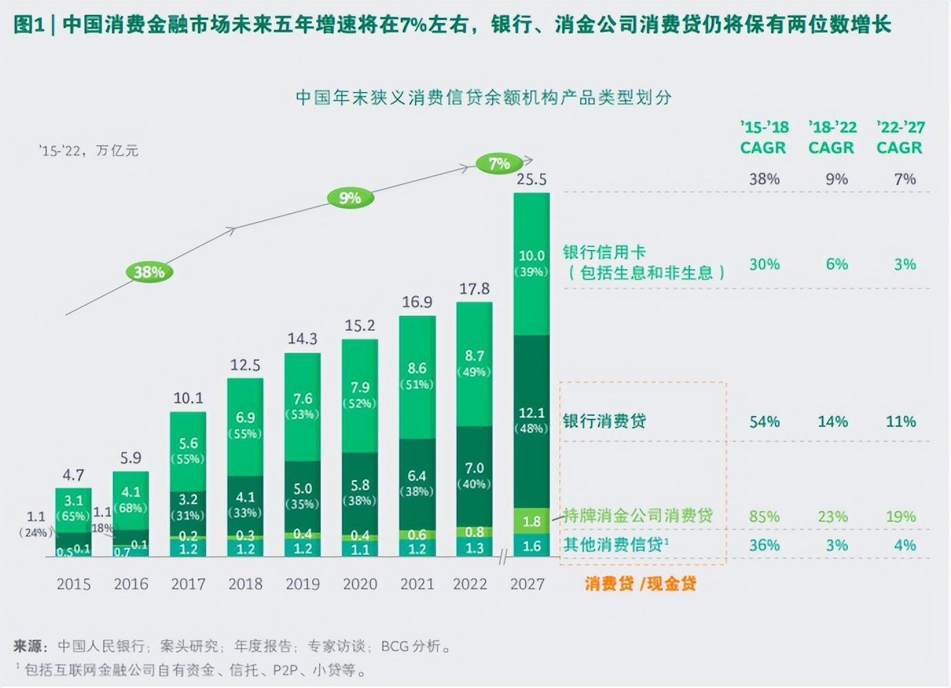 根据BCG(波士顿咨询)预测,到2027年,中国消费金融总规模将达到25万亿元,其中银行及消金公司的消费贷仍将保有两位数的增长,持牌消金公司消费贷的复合年增长率更高达19%,远超开打消费贷利率价格战的银行消费贷的11%,以及银行信用卡的3%。不难看出,虽然持牌消金公司消费贷的增速有所降低,但对比银行信用卡和银行消费贷而言仍然保有较大优势。