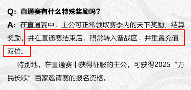 在近5个征服赛季内征服次数≥1的所有玩家自动获取报名资格,但有且仅能进行一个批次的比赛,且在直通赛结束,直接转入备战区,并重置充值双倍。