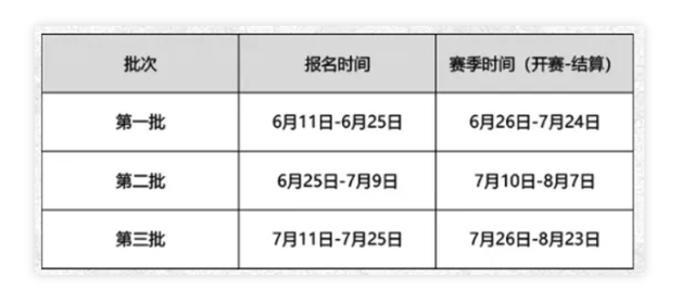 官方会在6月到7月会开放3个批次,玩家可以根据自己和盟会小伙伴的时间灵活安排。第一批报名时间在6月25日截止,6月26日至7 月24日进行比赛;第二批在7月9日截止,7月10日至8月7日进行比赛;第三批报名时间在7月25日截止,7月26日至8月23日进行比赛。