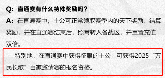 如今,这个直通赛给了大家一个超棒的机会,你只要参赛,就有可能成为笑到最后的王者,获得直通《率土之滨》2025 “万民长歌” 百家邀请赛正赛的资格,站在率土最顶级的赛事舞台,让自己的谋略与操作被所有人看见。