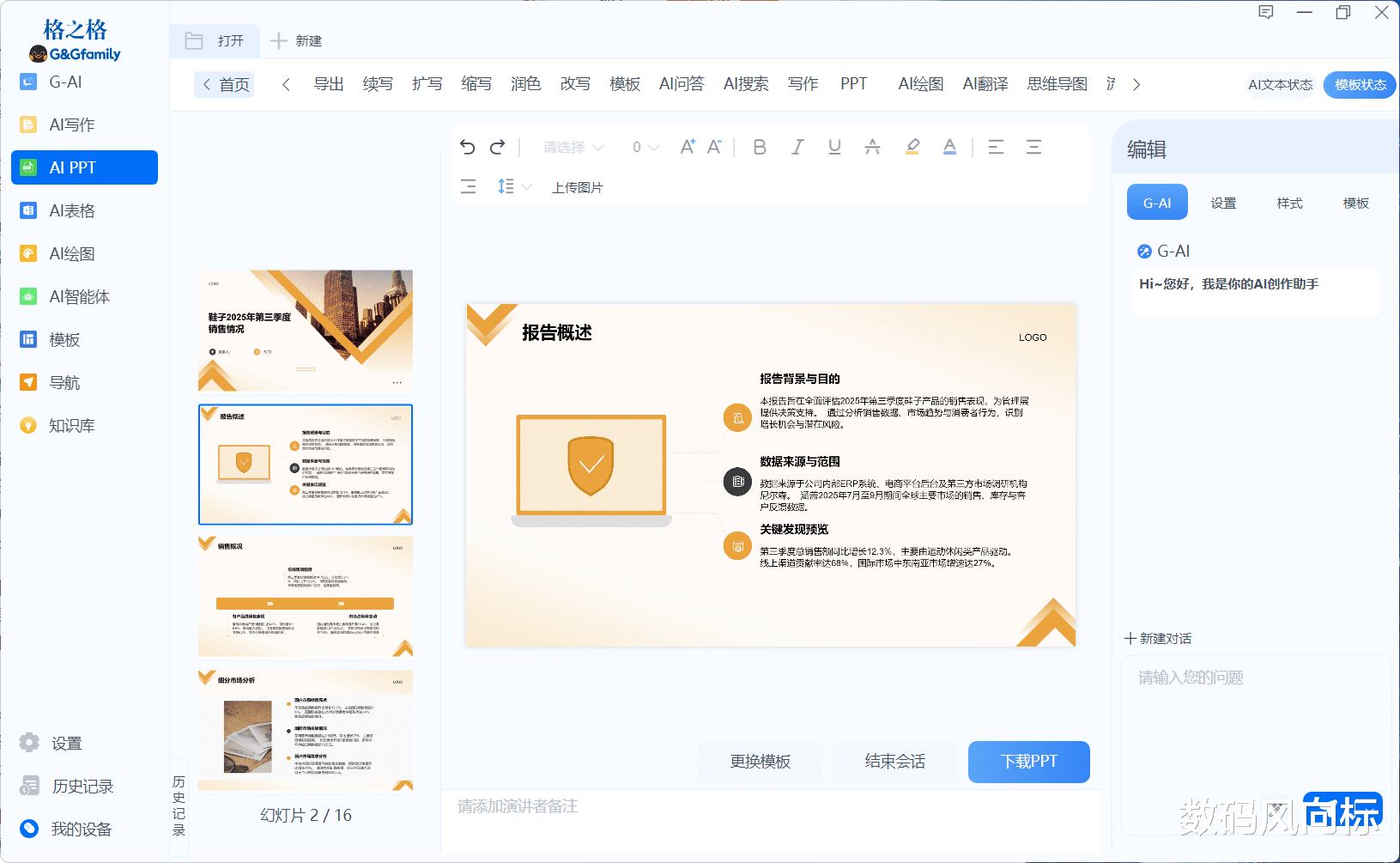 PPT制作辅助是另一个宣传重点。通过AI键可以快速生成PPT大纲和内容建议。我尝试命令“生成一个关于季度销售数据的PPT结构”,键盘确实提供了包括标题页、数据摘要、图表分析等基本结构,从大纲到PPT文件一气呵成,还有丰富的模板可以直接套用,这确实加快了操作体验,不需要再从零开始了。