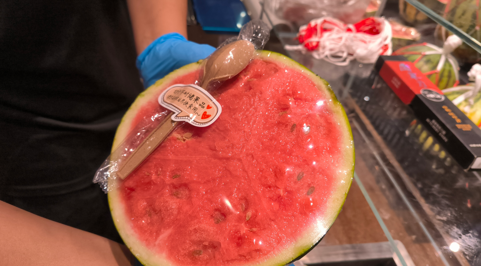 我挑了半个西瓜,工作人员蒙上保鲜膜,还不忘附上一个小勺。我问她,你们调改后,和之前发生了哪些变化?她说,一是增加了免费加工服务:比如水果区可以免费帮着把水果切成小份;二是增加了一些胖东来的自有的品类;三是增加了客户休息区。