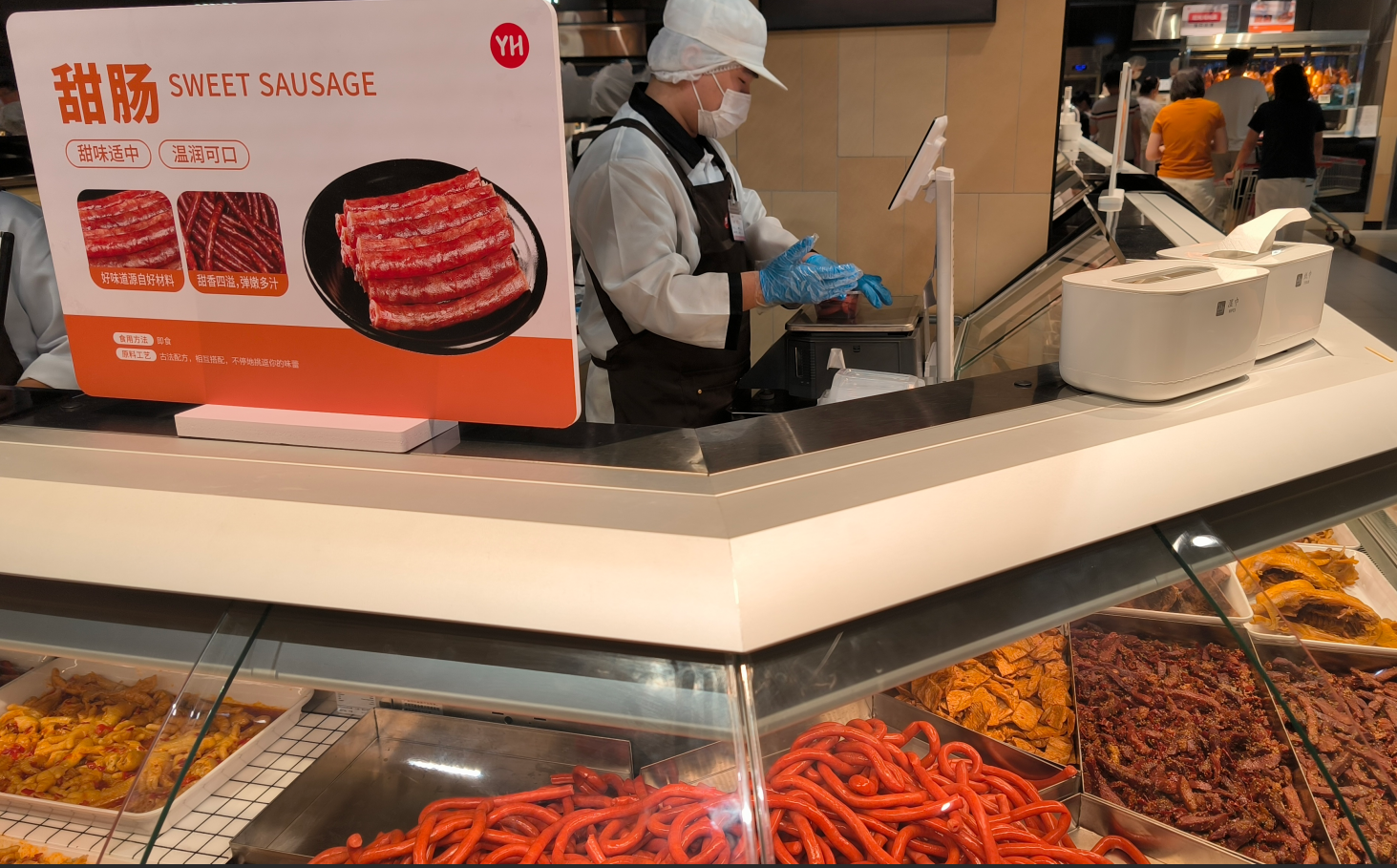 在熟食区,出现了原来没见过的细甜肠,售货员说这是胖东来同款。