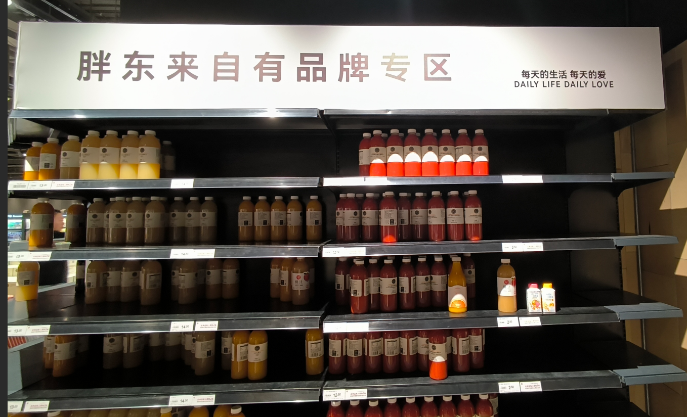 超市的北侧是胖东来自有品牌专区,面积不大,但感兴趣的顾客不少。这里主要是啤酒、果汁饮品、清洁湿巾、果蔬餐具净、洗衣凝珠等,据说还有毛巾,摆在了其他地方。