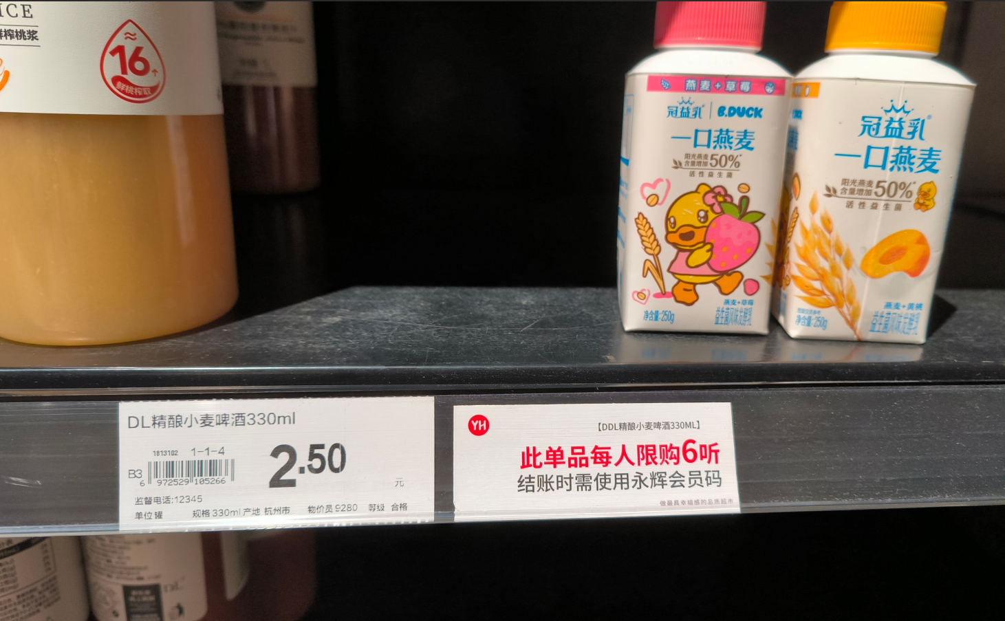 DL精酿小麦啤酒货架是空的。后来结账的时候工作人员告诉我,这款啤酒很受欢迎,需要早上早点来,是有可能买到的。这里的每款商品价签旁边都有一个限购提示,此单品每人限购2瓶到10包不等。