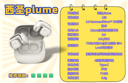 西圣Plume蓝牙表现超越同价位,搭载最新蓝牙6.0芯片,支持60ms电竞级低延迟,玩游戏、追剧几乎感受不到延迟。续航28小时,4级专业防水,还配Ai高清通话降噪,通话清晰稳定。一百多元,就能享受接近千元耳机的音质与性能,性价比无敌,真心让人不入手都难!