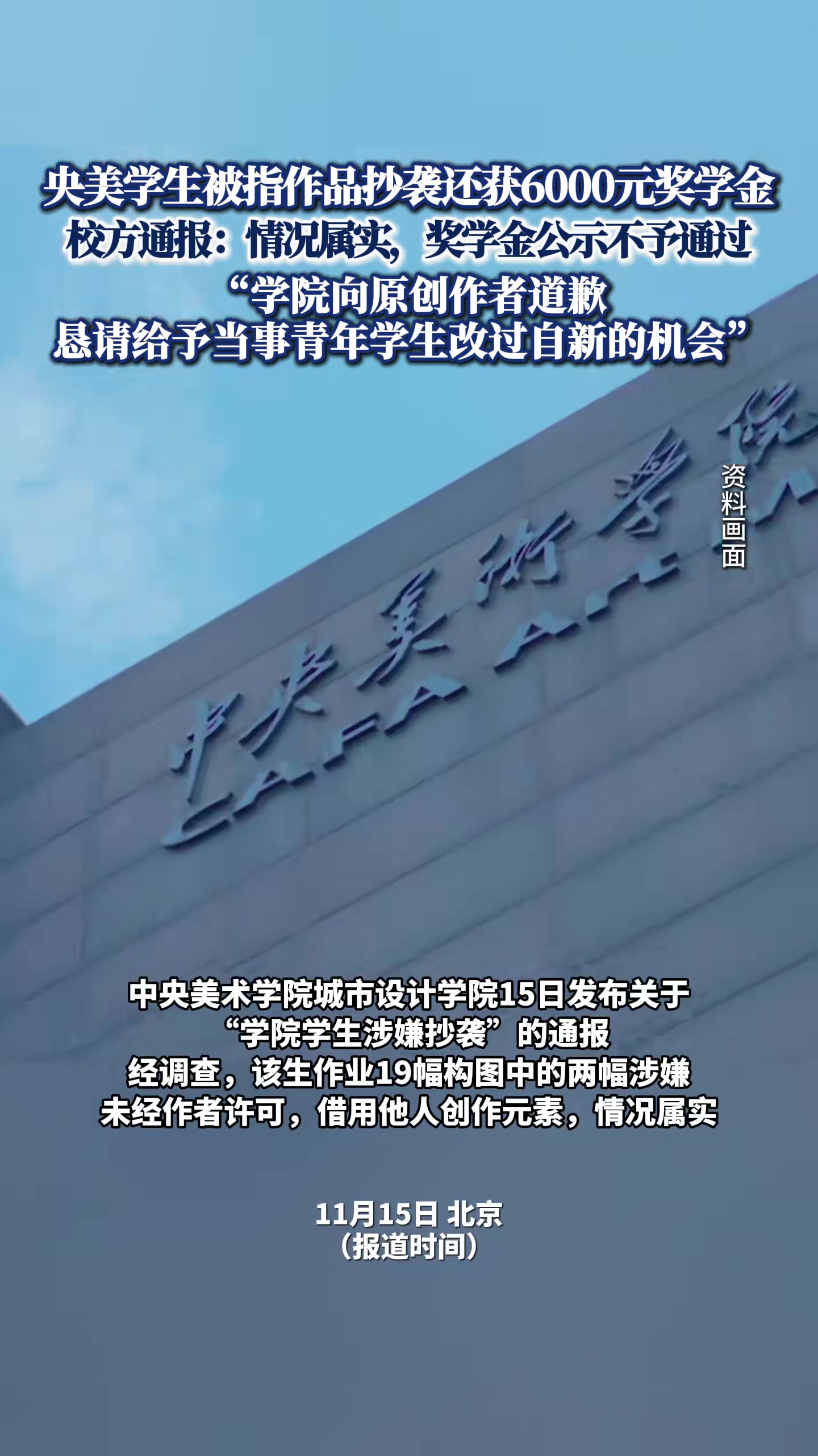 11月15日,中央美术学院城市设计学院官方账号发布情况通报: