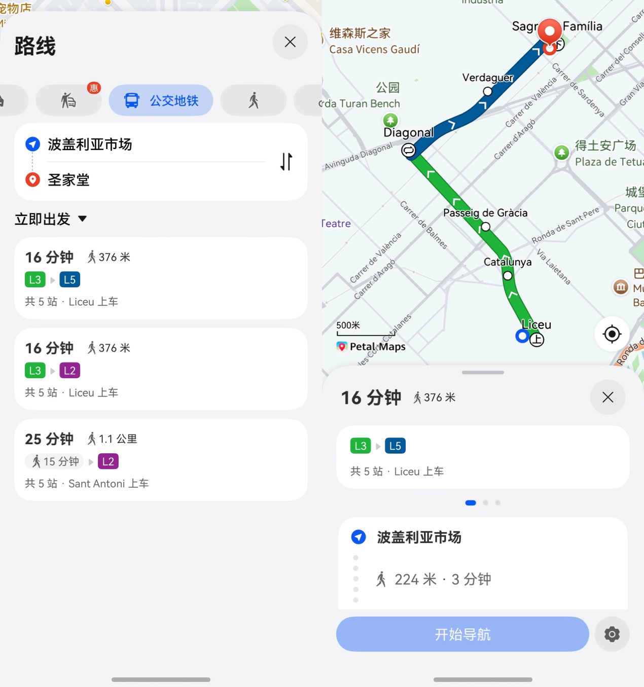 在导航方面,我打算尝试下花瓣地图,避免远在欧洲容易迷路的问题。它全程都是中文界面显示、中文语音播报,我不管搜“圣家堂”、“波盖利亚市场”这种热门景点,还是搜小巷里的本地餐厅,都能精准找到,路线规划也清晰明了。