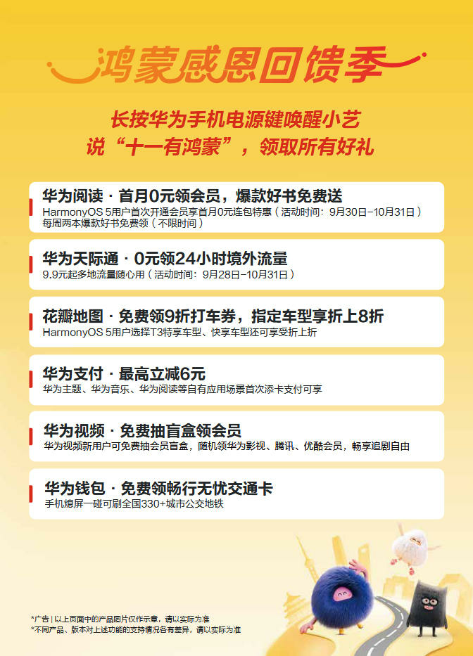 如果你的中秋国庆假期计划也是出境游,一定要试试这些功能。而且最近升级到鸿蒙5.1的小伙伴,从桌面右滑到负一屏参与“鸿蒙有礼”活动,每天都有现金红包+随机超值好礼可以拿,包括元服务优惠券、华为视频、华为音乐等会员都有机会到手,给这段旅途增添更多乐趣。惊喜不止于此,最近正值鸿蒙感恩回馈季,长按华为手机电源键唤醒小艺,说“十一有鸿蒙”,有华为支付最高立减6元、华为视频免费抽盲盒领会员等各种好礼可以领呢,超级心动了!