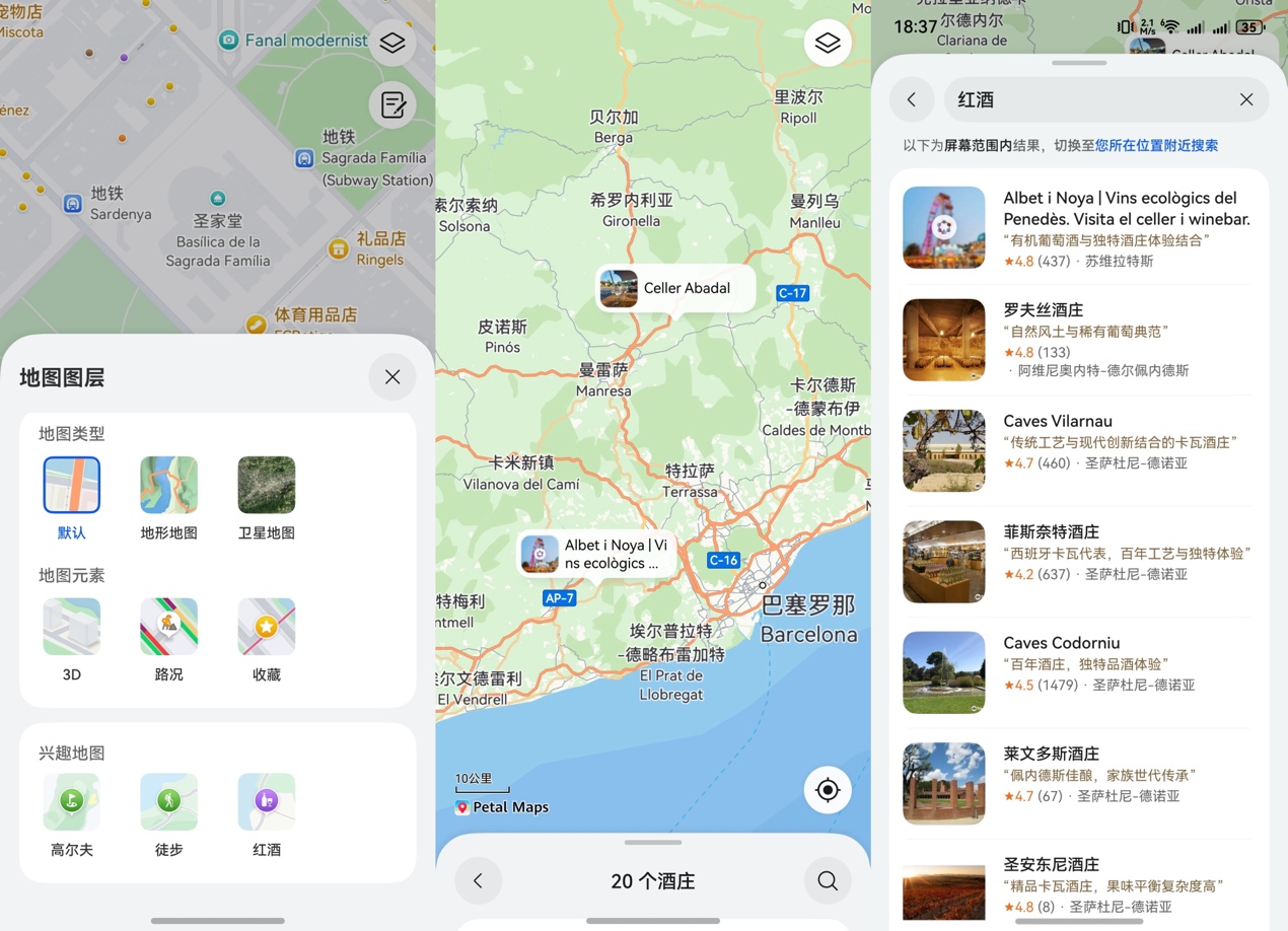 花瓣地图推出的“兴趣地图”也超实用。比如点开“红酒地图”,它能一键筛选出加泰罗尼亚周边的红酒庄园,我们不仅能清晰看到酒庄位置,还能直接查看整合好的酒庄评分、庄园历史以及产品特色等,轻松规划一场“微醺之旅”。而且步行导航时,不用一直盯着手机,通过实况窗提示和手表协同功能,大家都能更专注地欣赏眼前的风景。
