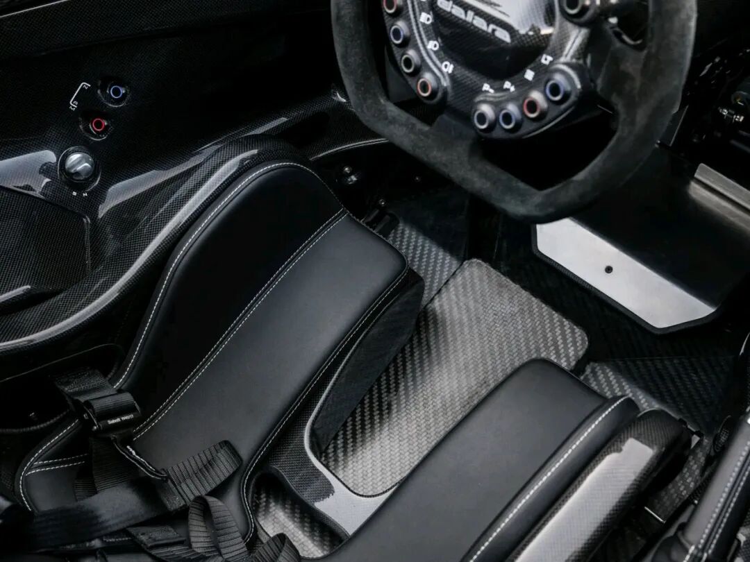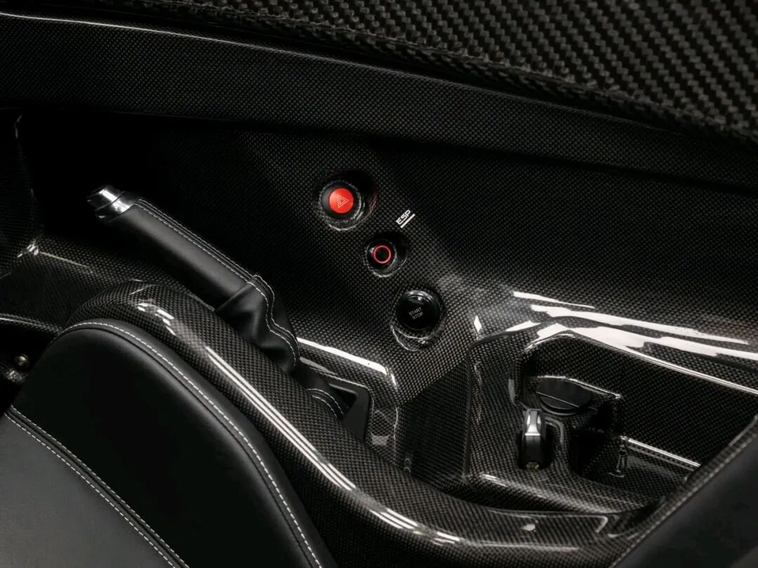 方向盘和数字仪表盘与基础款车型保持一致,主要控制键和转向灯指示灯被整齐地布置在碳纤维面板上。座椅右侧是机械式手刹拉杆,这也是从原版车型继承下来的一个重要标志。