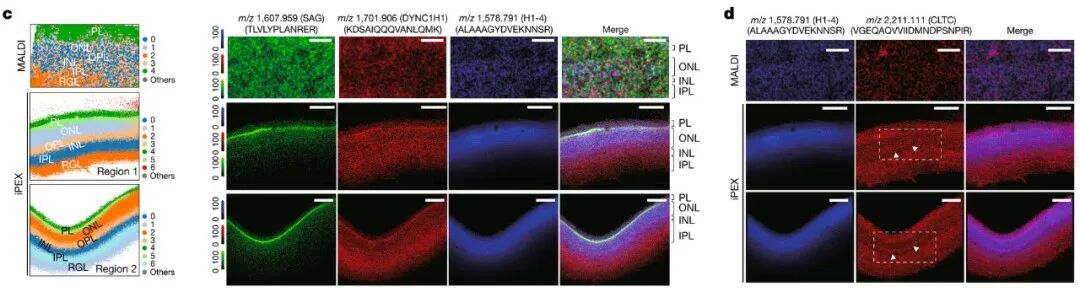 看清精细结构。在小鼠视网膜,iPEX 将有效像素尺寸(EPS)压到约 4.8μm,能够解析厚度仅 15–25μm 的突触外层(OPL),检测到 334 种(≥2 个独特肽段)潜在蛋白,是传统质谱成像的约 16 倍。iPEX 绘出包括 CLTC 等突触相关蛋白在 OPL 的特异性分布,以及 SAG、DYNC1H1 等标志蛋白的分层定位,为精细神经环路和视觉信号传递机制提供了蛋白水平的直接证据。