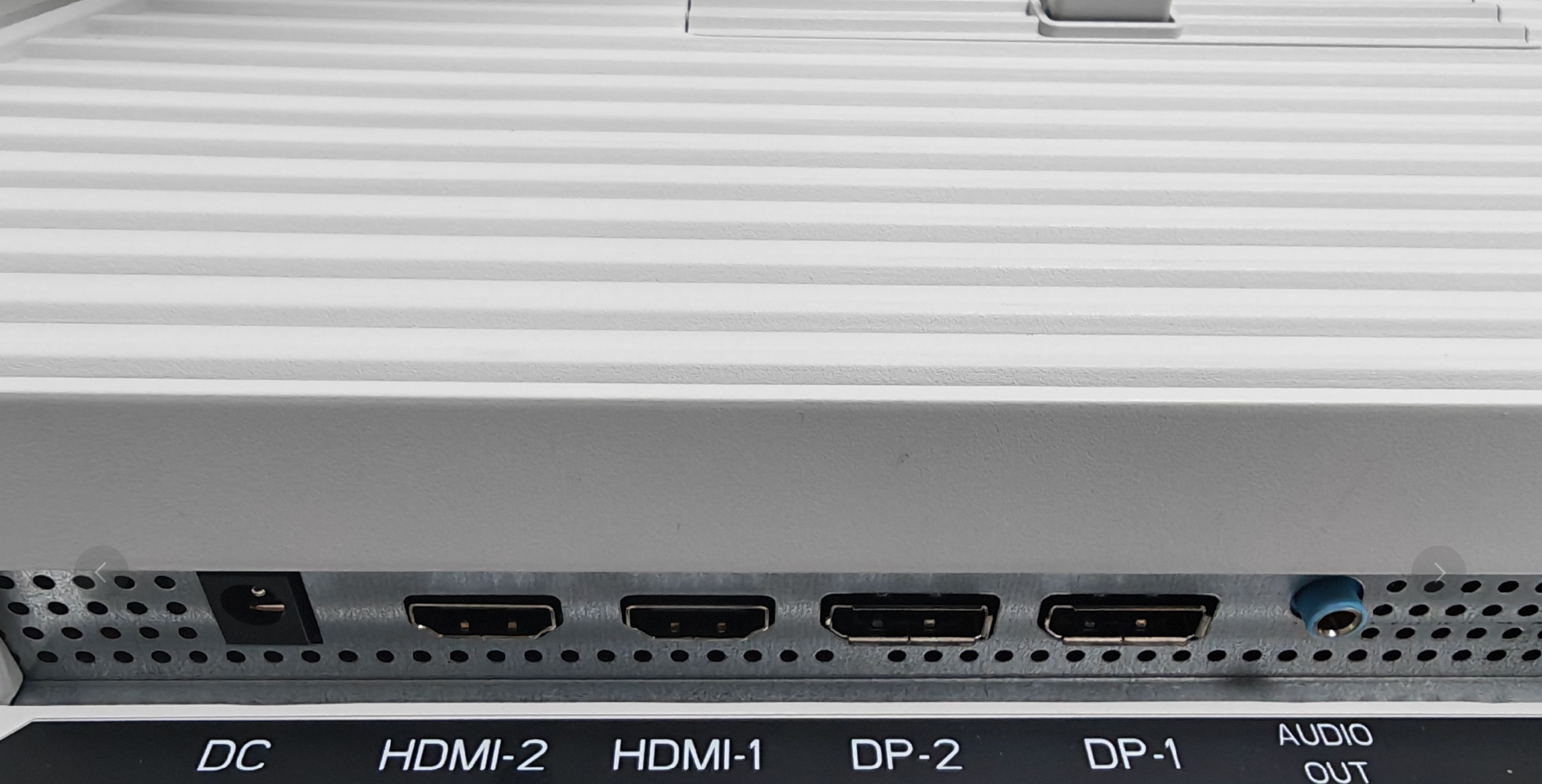 通电前先看看接口,SANC S82的接口都放在了显示器的背部,除了电源 DC 口,还有两颗HDMI2.0和两颗DP1.4 接口,并且还支持100*100mm壁挂,另外还有个外接音箱或耳机的 AUDIO OUT 接口,HDMI 和DP口都默认支持 2K 210Hz高刷模式。