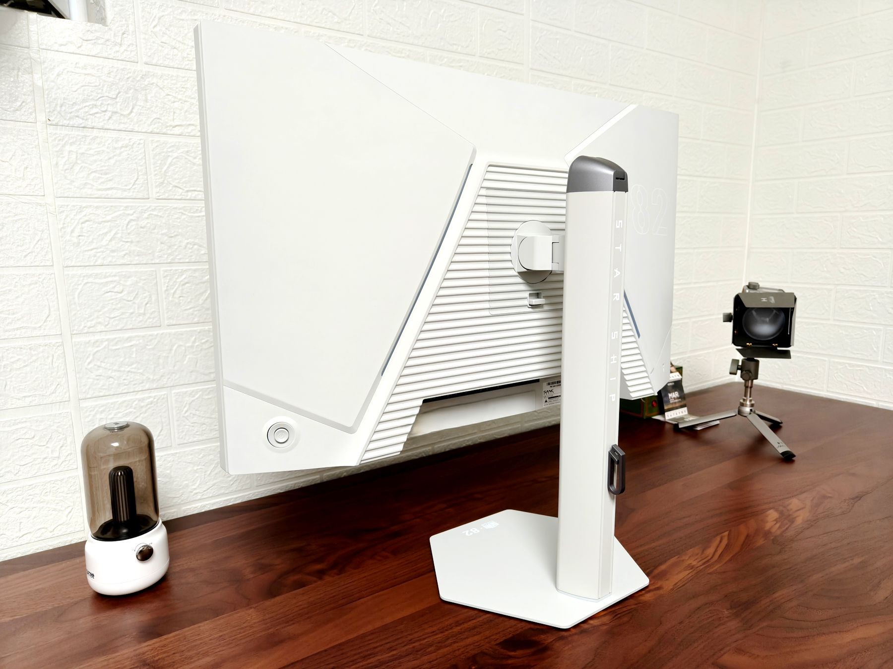 先说下外观,这款盛色的显示器主打的就是 “海景房 CP”,所以配色方面采用的是 “星尘白” 的配色,感觉比起我家之前花了四五千买的明基显示器好看太多了,机身表面是细磨砂质感的 “星际级耐造色”,和我的迷你主机摆一起,相当搭,而且整个机身更抗指纹、耐刮擦,用指甲轻划边框也没留下痕迹,我用了差不多也半个多月了,没有出现发黄的现象,白色的家电最怕时间久了发黄,这个涂层工艺我觉得和旗舰手机用的工艺差不多。