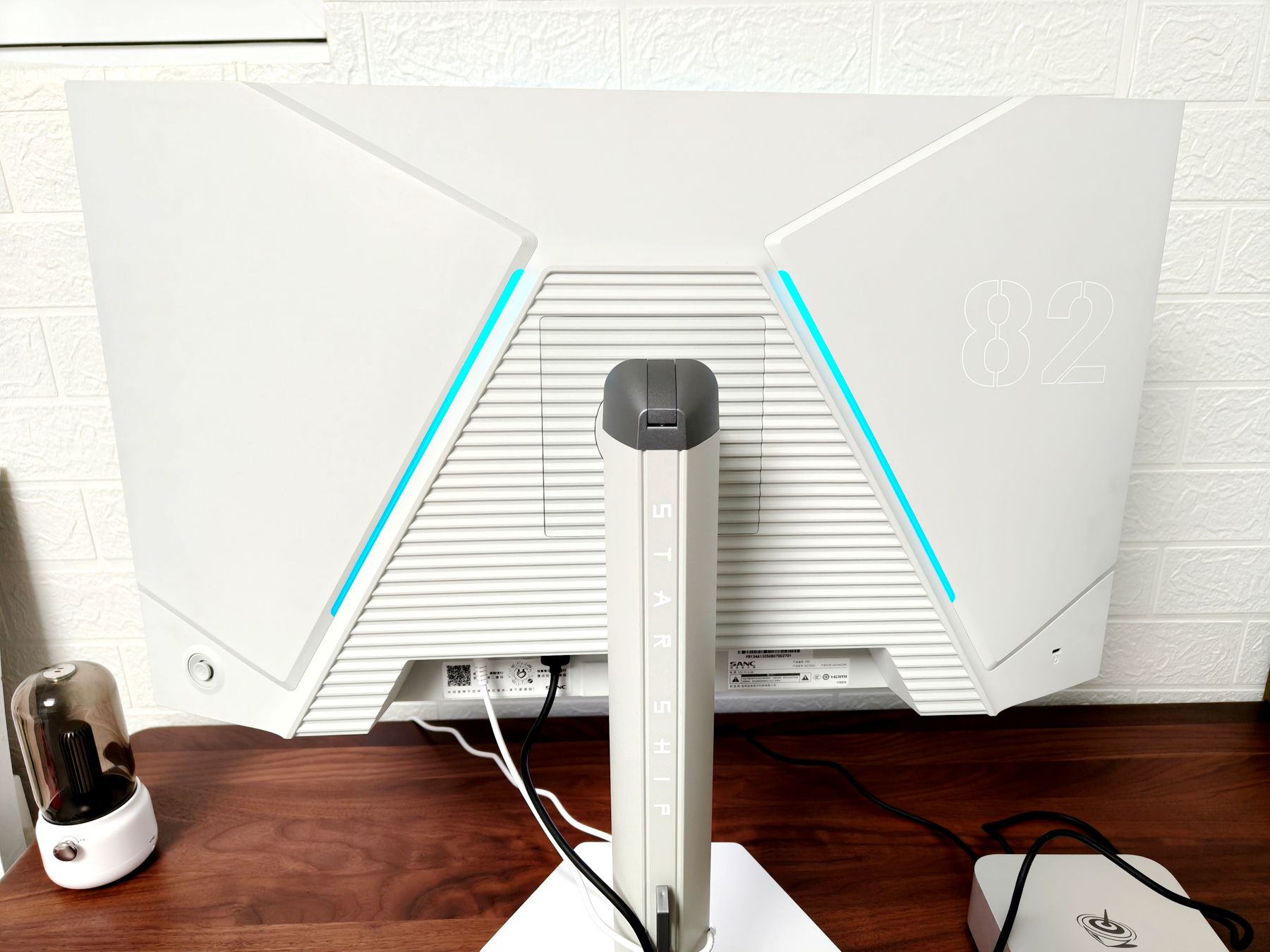 而且显示器的背部做了 “蓝刃光剑” 的RGB 灯效 ,不是那种浮夸的跑马灯,而是像星舰引擎启动时的脉冲一样的光效,我觉得挺好看的。从金属支架根部向上延伸,可以看到屏幕底部的一个 “屏下小夜灯”,晚上用电脑,这个小夜灯也挺有氛围感的。另外在显示器背部还涉及了合金耳机支架,方便日常收纳耳机。