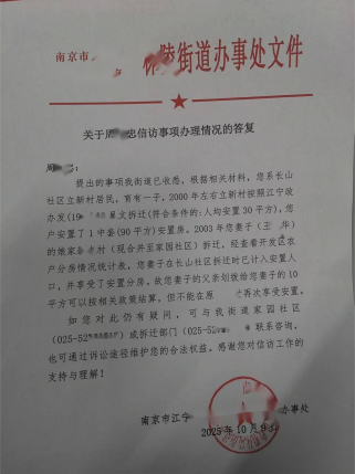 近日,南京市江宁区某街道居民王女士(化名)向南京市江宁区某街道相关单位提交材料(相关文件记录日期可追溯至 2025 年 10 月前后),详细反映其 2003 年房屋拆迁后,近 20 年来始终未拿到应得的安置房及各项补偿款,同时直指当地街道、所属社区(原某村,现合并为家园社区)、街道拆迁办存在履职违规问题,恳请上级部门介入调查,维护其合法权益。