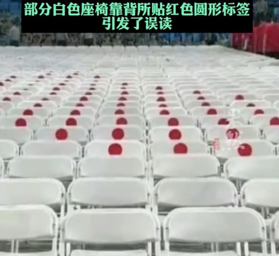“为引导师生按设计的造型图案准确入场就座,工作团队在部分白色座椅和蓝色座椅靠背上,用红色、黄色等不同颜色和圆形、五角星形等不同形状的标签进行了分类标识,其中部分白色座椅靠背所贴红色圆形标签,引发了误读。我们对此深表歉意,今后将更加注重工作细节,提高工作严谨性。”