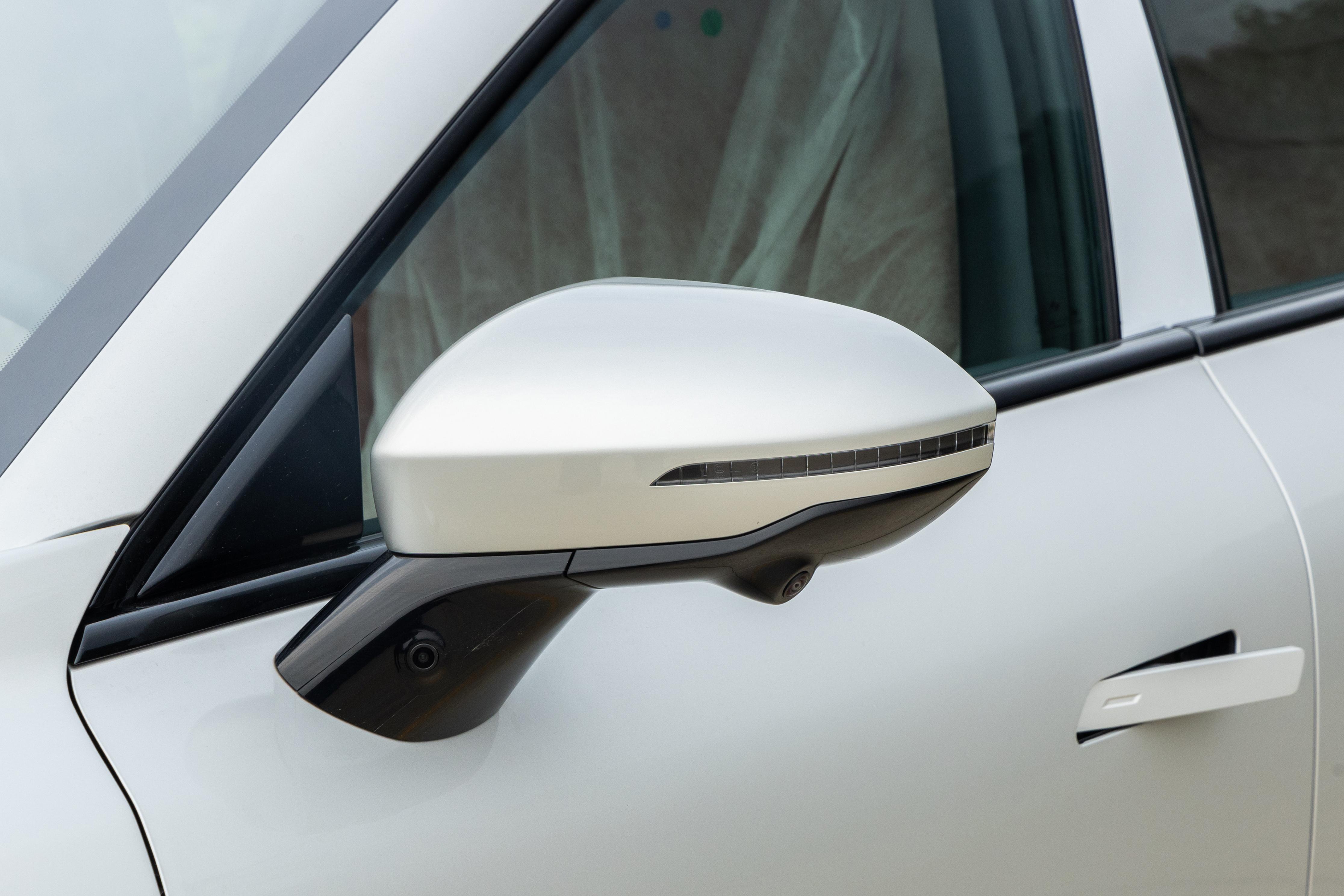 19英寸熏黑轮毂搭配红色卡钳,再配合马牌静音轮胎,静止状态下彰显出沉稳质感,行驶时则自带几分运动气息,兼顾颜值与行驶静谧性。蝶影光毯投影灯的实用性较强,当使用者靠近车辆时,门把手下方会投射出品牌LOGO与光带,夜间接人或停车时更具格调。该投影灯拥有三种模式可供选择,浪漫模式可投射出星光效果,战斗模式则呈现红色射线,偶尔切换模式,能够为日常用车增添些许趣味。后视镜上的辅助驾驶小蓝灯,工作时会缓慢闪烁,既能提醒使用者辅助驾驶功能处于开启状态,也能让过往路人有所留意,细节考量较为周全。