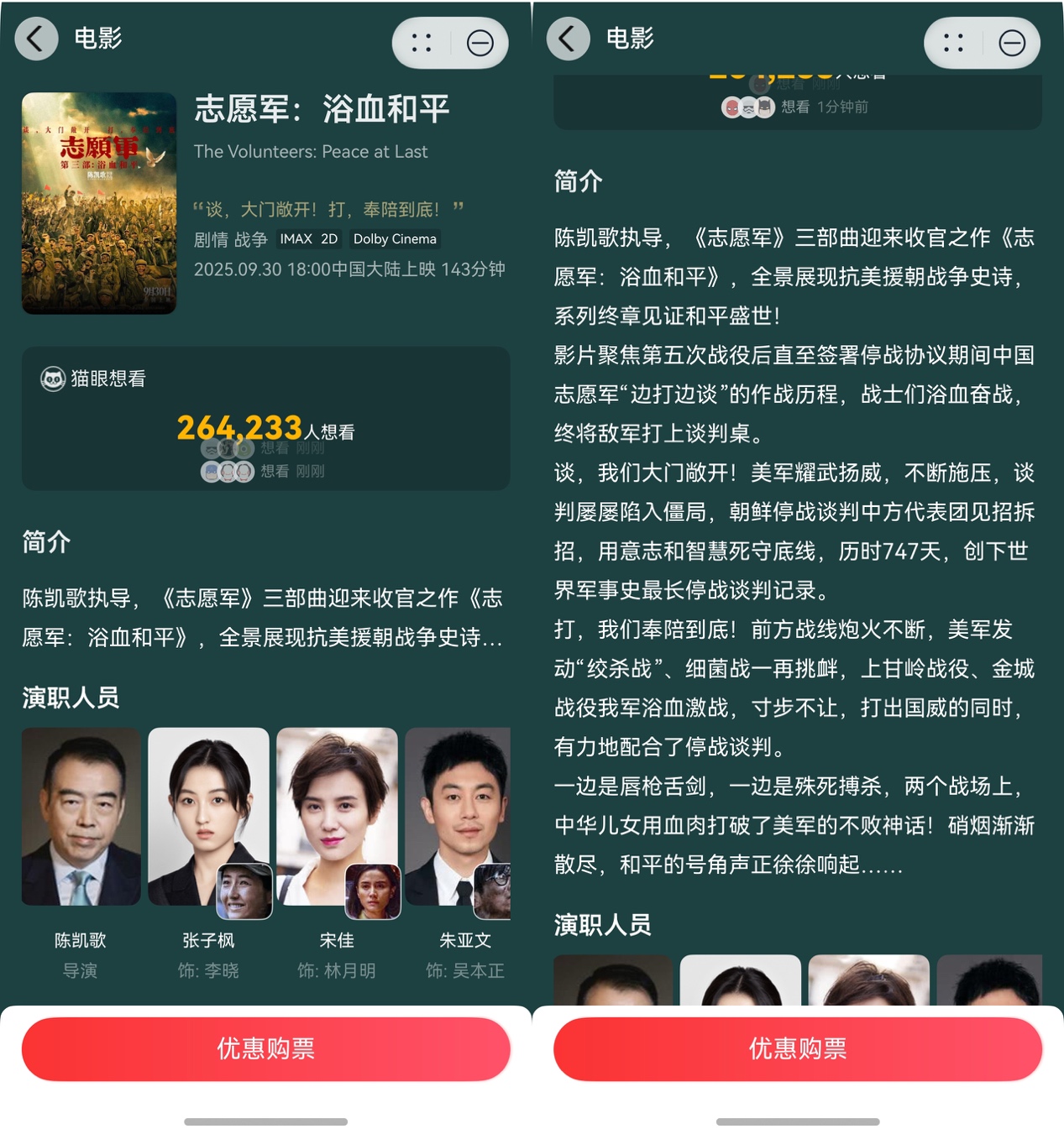 今年我最想看的国庆档电影有两部,也是我计划推荐给大家的!首先,《志愿军:浴血和平》一定要去看,感觉是整个国庆档里最重头的一部,还是整个志愿军系列的收官之作。听说这次电影里会呈现上甘岭战役、金城战役等战场前线血火交锋以及谈判桌上的外交博弈等场面,让大家感受到和平的来之不易!我已经迫不及待了!演员阵容基本还是之前的班底,我喜欢的张子枫也在其中,虽然她是新生代演员,但是她的演技一直在进步,期待她的表现!