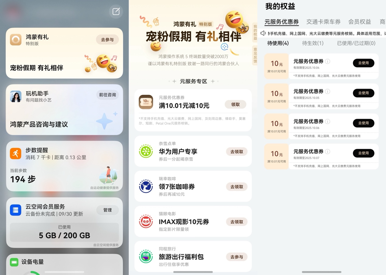 其他还有像《浪浪人生》、《猪猪侠:一只老猪的逆袭》这种氛围轻松一点的电影,喜欢喜剧的小伙伴别错过。对了,如果你跟我一样也是鸿蒙5用户,那你在看电影之前一定要领“鸿蒙有礼特别版”这个福利。在9月30日到10月8日之间,每天都可以领价值10元的元服务优惠券,不仅在猫眼电影元服务下单可以用,看之前想买杯奶茶,也可以在奈雪点单元服务使用。如果领满9天就是9张,加起来能省90块呢!找不到入口的小伙伴可以在手机桌面右滑到负一屏,搜索“鸿蒙有礼”即可~赶快行动起来吧!