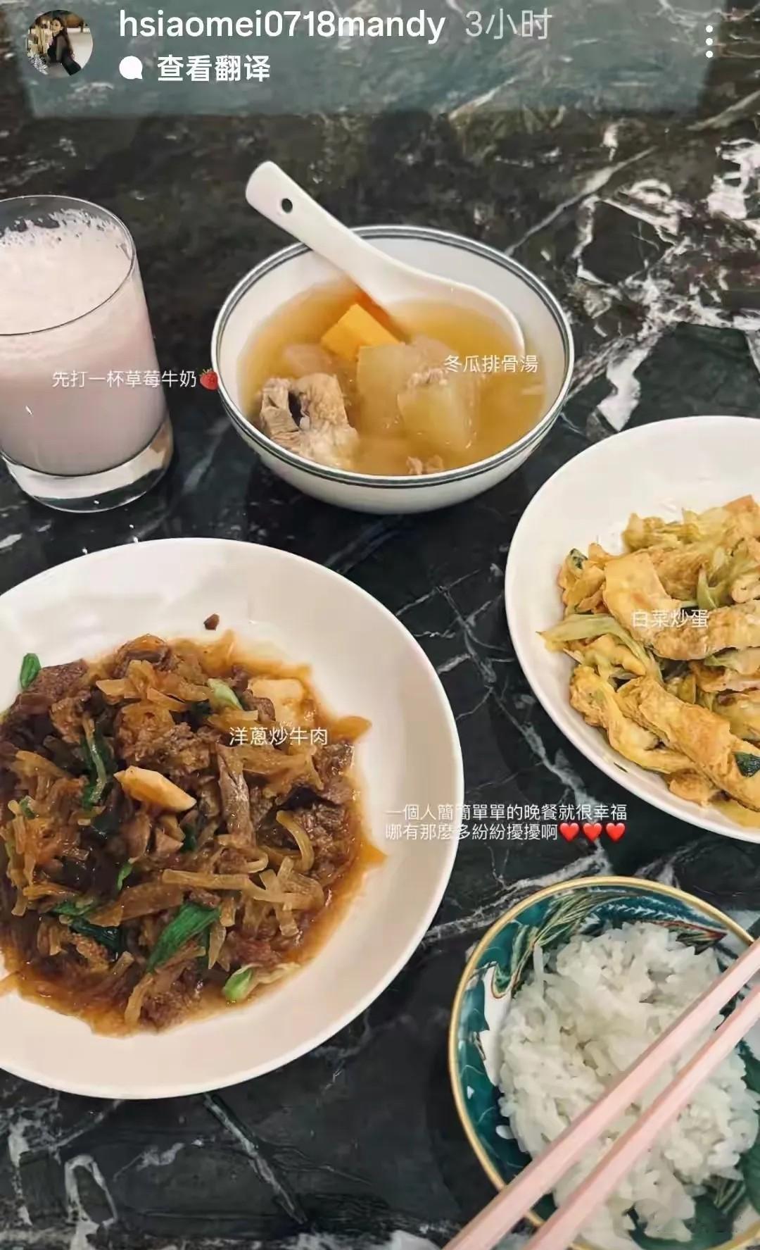 这一次,因为老婆怀孕了,飞来飞去会很累,所以汪小菲出差没有带马筱梅。老公出差,她自己一个人在北京也过的很好,晒出一个人的晚餐,简单且丰盛。有冬瓜排骨汤、洋葱炒牛肉、白菜炒鸡蛋、还有白米饭外加一杯草莓牛奶。并配文:一个人简简单单的晚餐很幸福,哪有那么多的纷纷扰扰啊!