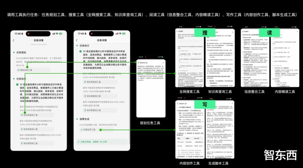用户开启“任务模式”后,ima将基于全网或知识库数据,通过LLM自主拆解、规划任务步骤,并调用精读内容、全网搜索、知识库查询、内容创作等工具完成用户输入的指令,并在执行过程中自我监测与修正,最终产出可直接使用的结果,将搜读写的工作流一体化。