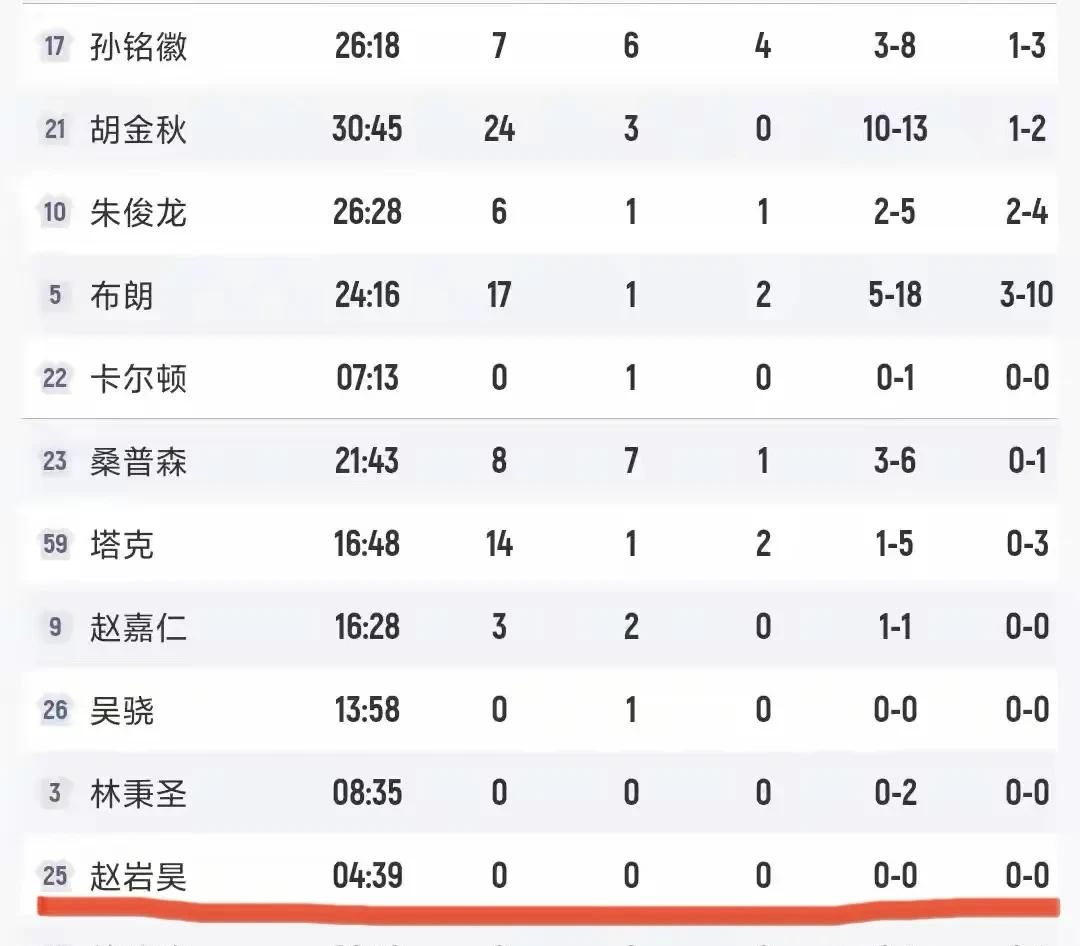 自从赵岩昊拿到了顶薪之后状态就越来越差了,上赛季半隐身状态打完了整个赛季,数据还比不上替补球员,打一场就休息两场,仿佛玻璃人一样。这个赛季赵岩昊也是毫无表现,防守和进攻都害怕对抗,只能偶尔投个篮,作为球队的三名顶薪球员之一,完全不能帮助球队,只能打打替补,白拿了600万了。