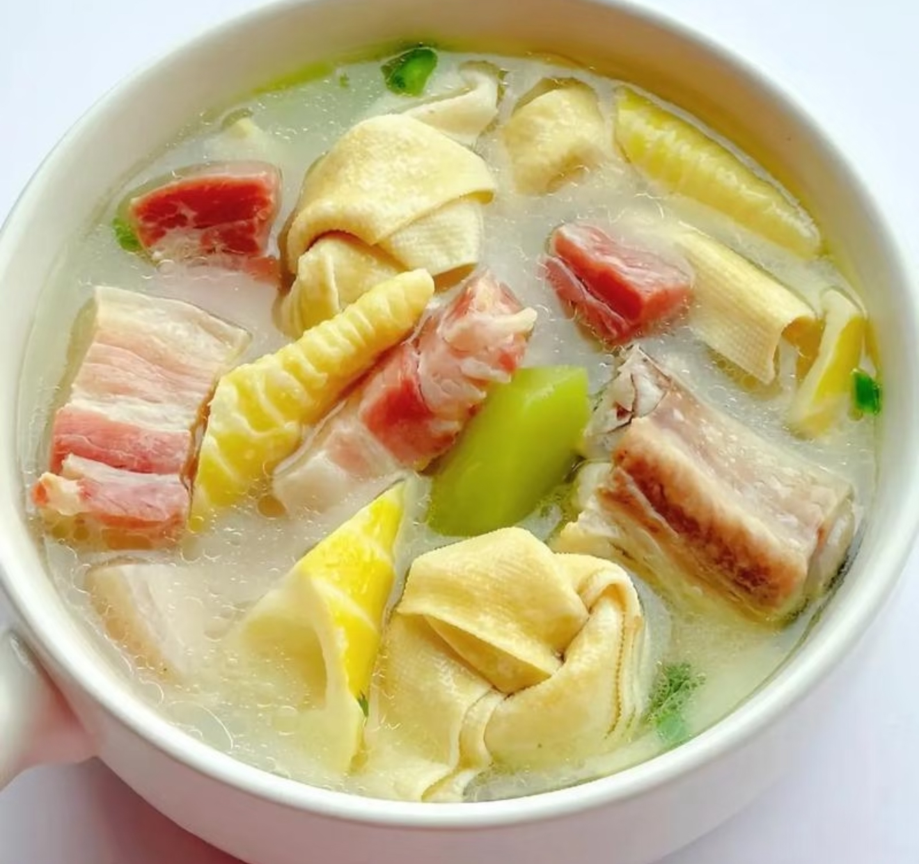 3. 点睛之笔(最后15分钟)当厨房飘出混合着咸香与鲜甜的雾气时,放入泡好的百叶结继续炖煮。出锅前撒把青葱花,喜欢胡椒味的可以现磨些白胡椒提鲜。记住!全程不要加盐,咸肉的咸度刚刚好。