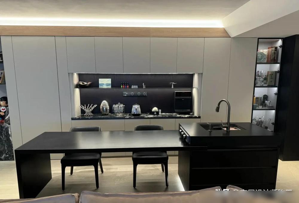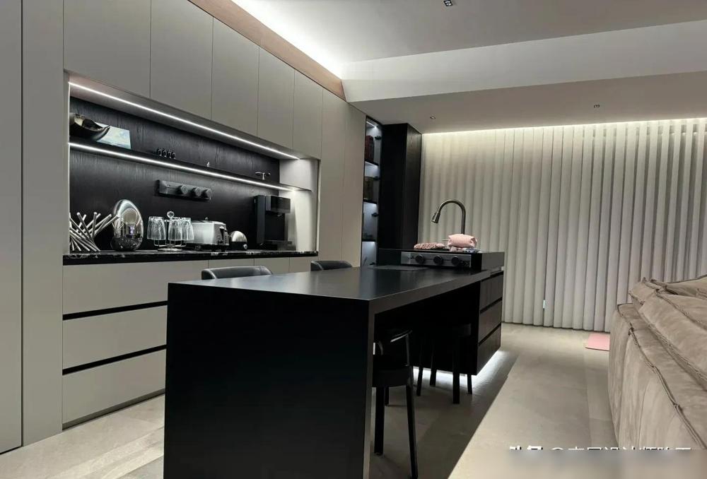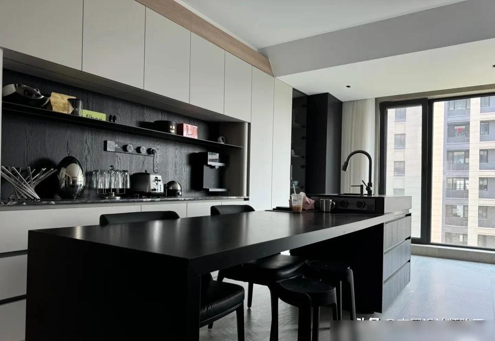 餐厅岛台加餐桌的设计,越来越常见了。既能当操作台,又能储物,还能当隔断。朋友来了围坐一起,喝茶聊天都方便。旁边的餐边柜很实用,放小家电、杯具,解放厨房空间。