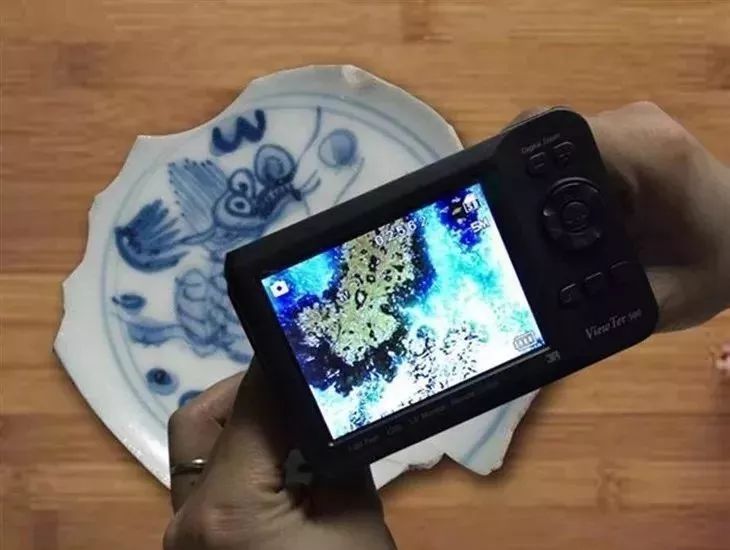 现代青花瓷贴锈斑放大镜观察瓷器四:上浮与下沉是区别真仿青花老品由于工艺上不同,则青花入骨,仿品青花上浮、不得入骨,差别很明显。