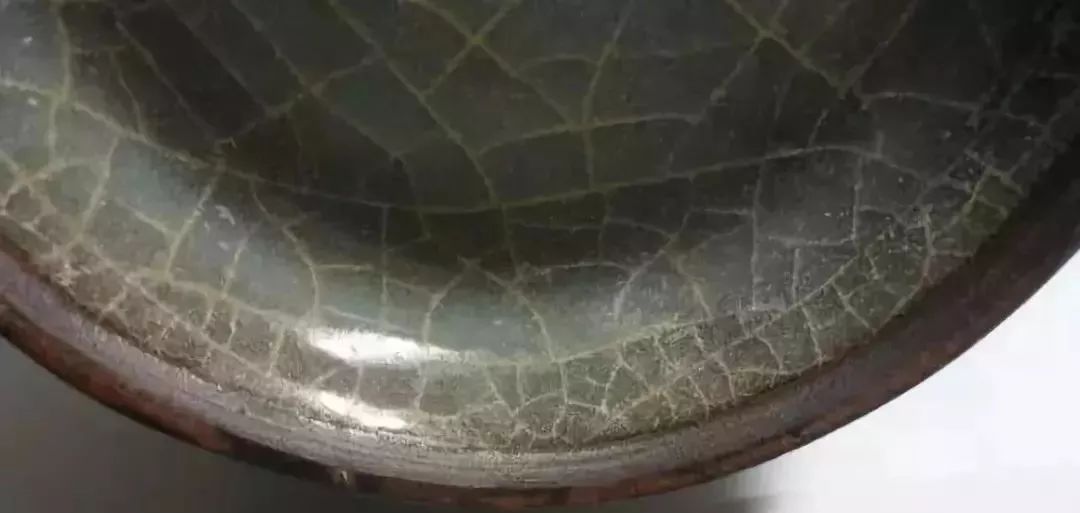 真吃土不在表层,是进入胎骨和釉下,它通过微孔沁入釉层,成为点状的“土斑”。土斑很小用眼直接看不到,必须在放大镜下才可见“土斑”。有的瓷器入土时间长,在土内恒温下并不开片,要出土后才会开片,所以真品吃土在不开片的地方,而开片的小缝内并没有土吃进去。这就更证明是自然“吃土”而不是人工做作,当然是老货。