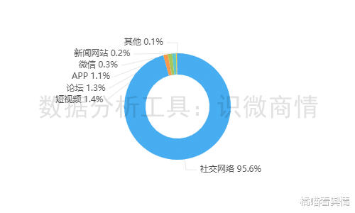 该时段内,有关“星巴克被指爆改成奶茶店”的舆情主要集中在社交网络平台,约占95.6%,其次为短视频(约占1.4%),论坛(约占1.3%)。