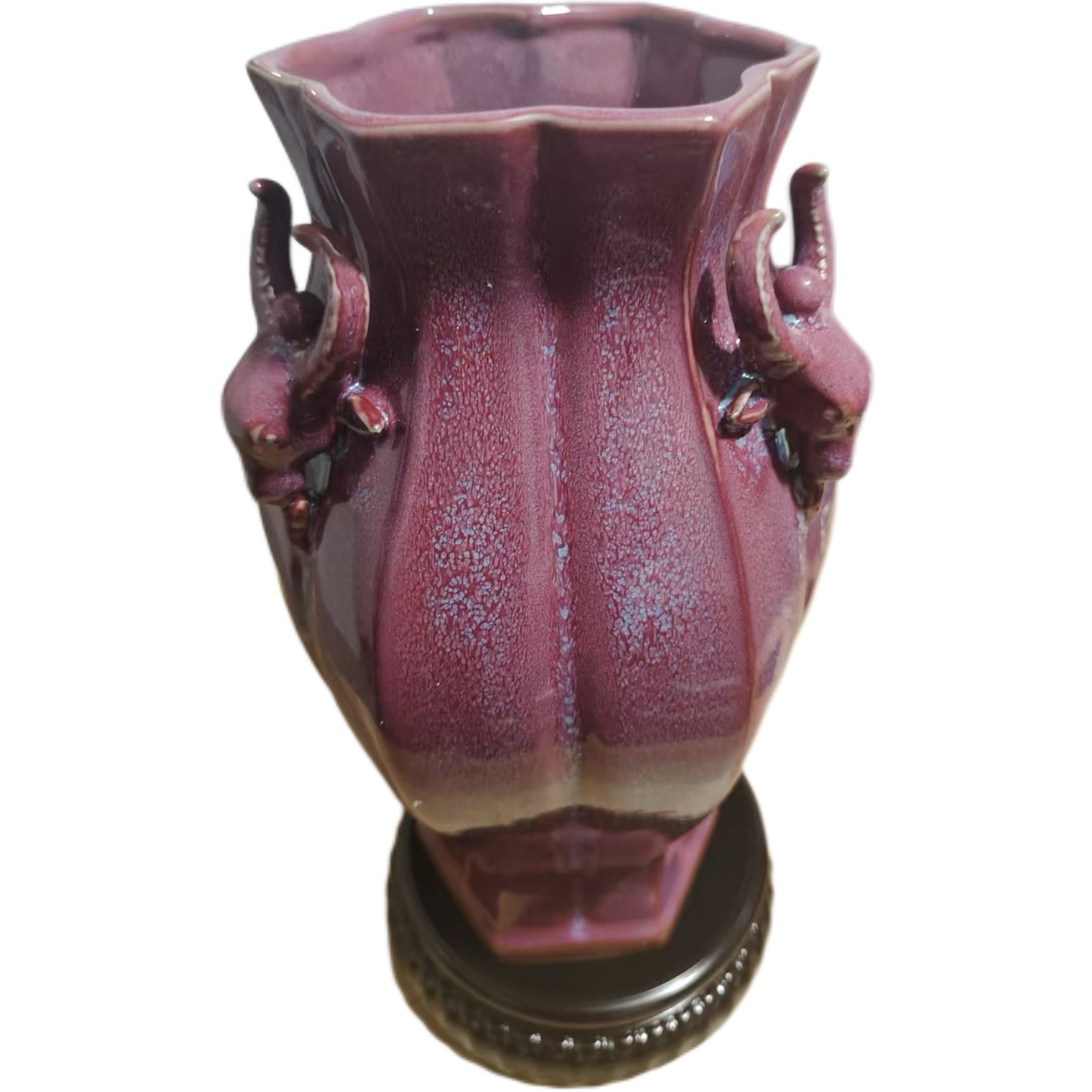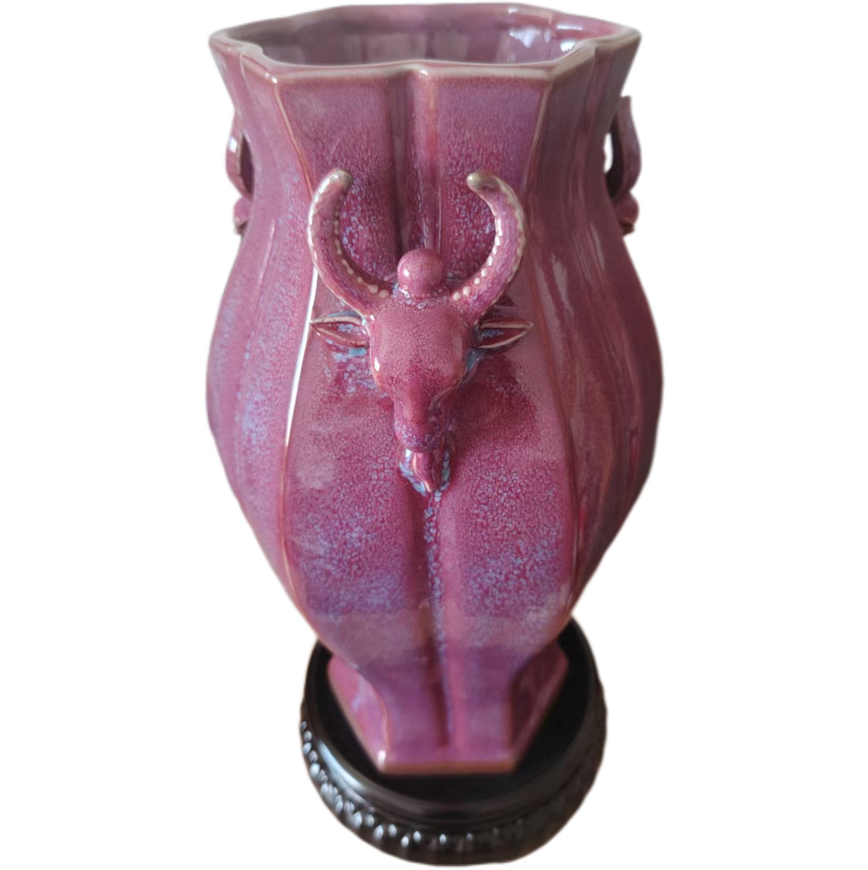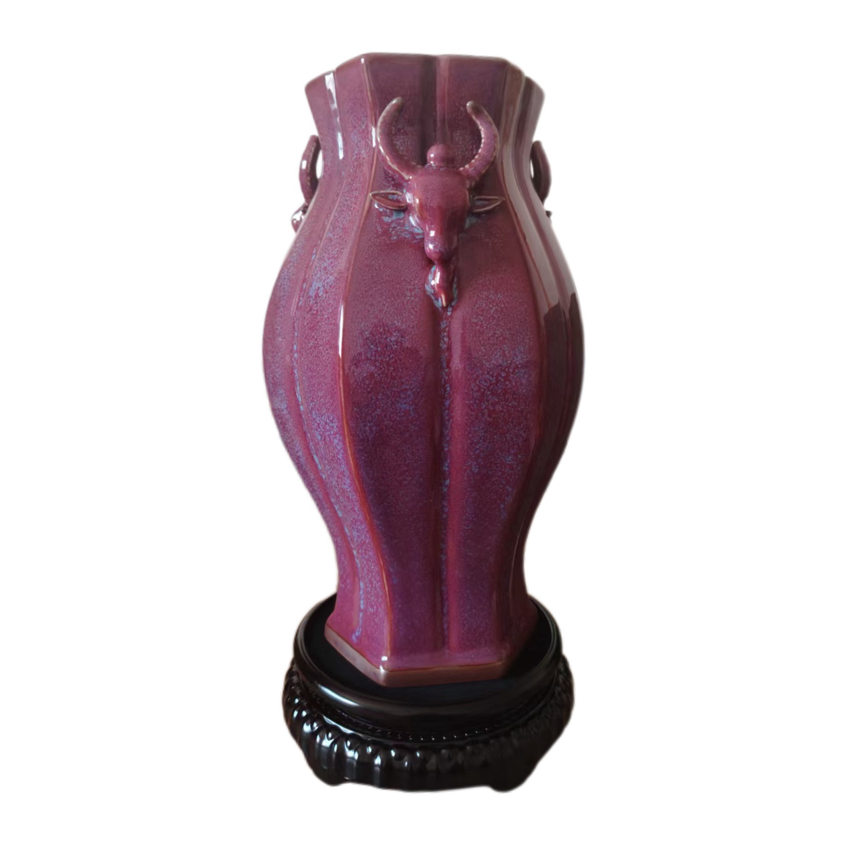 (二)钧瓷窑变:色彩与纹理的神奇演绎钧瓷的灵魂在于窑变,“三羊开泰尊” 的窑变效果极为出色。其釉色以瑰丽的紫红色为主调,其间夹杂着如流云般的蓝色、紫色斑纹,色彩相互交融、渗透,形成了变幻莫测的纹理效果。有的地方色彩浓郁如晚霞,有的地方则淡雅如薄雾,每一处窑变都是大自然与人力共同作用的神奇结果,不可复制,使得这件作品成为独一无二的艺术孤品,充分体现了钧瓷 “窑变无双” 的艺术特点。