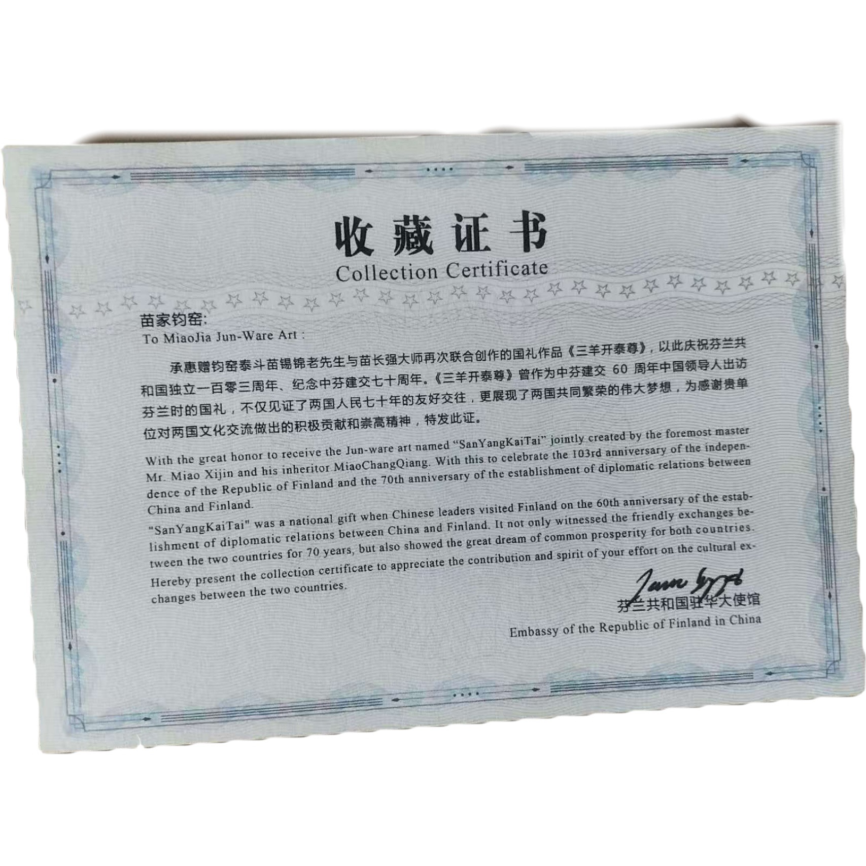 五、对外交流意义:中国文化的国际使者“三羊开泰尊” 曾作为中芬建交相关纪念活动的国礼,这充分体现了它在对外文化交流中的重要地位。作为国礼,它向世界展示了中国钧瓷艺术的魅力与中国传统文化的博大精深,成为中国文化与世界文化交流的桥梁与纽带。当外国友人收到这件精美的钧瓷作品时,不仅能感受到中国陶瓷艺术的精湛技艺,更能体会到其中蕴含的吉祥寓意与文化内涵,从而增进对中国文化的了解与喜爱。