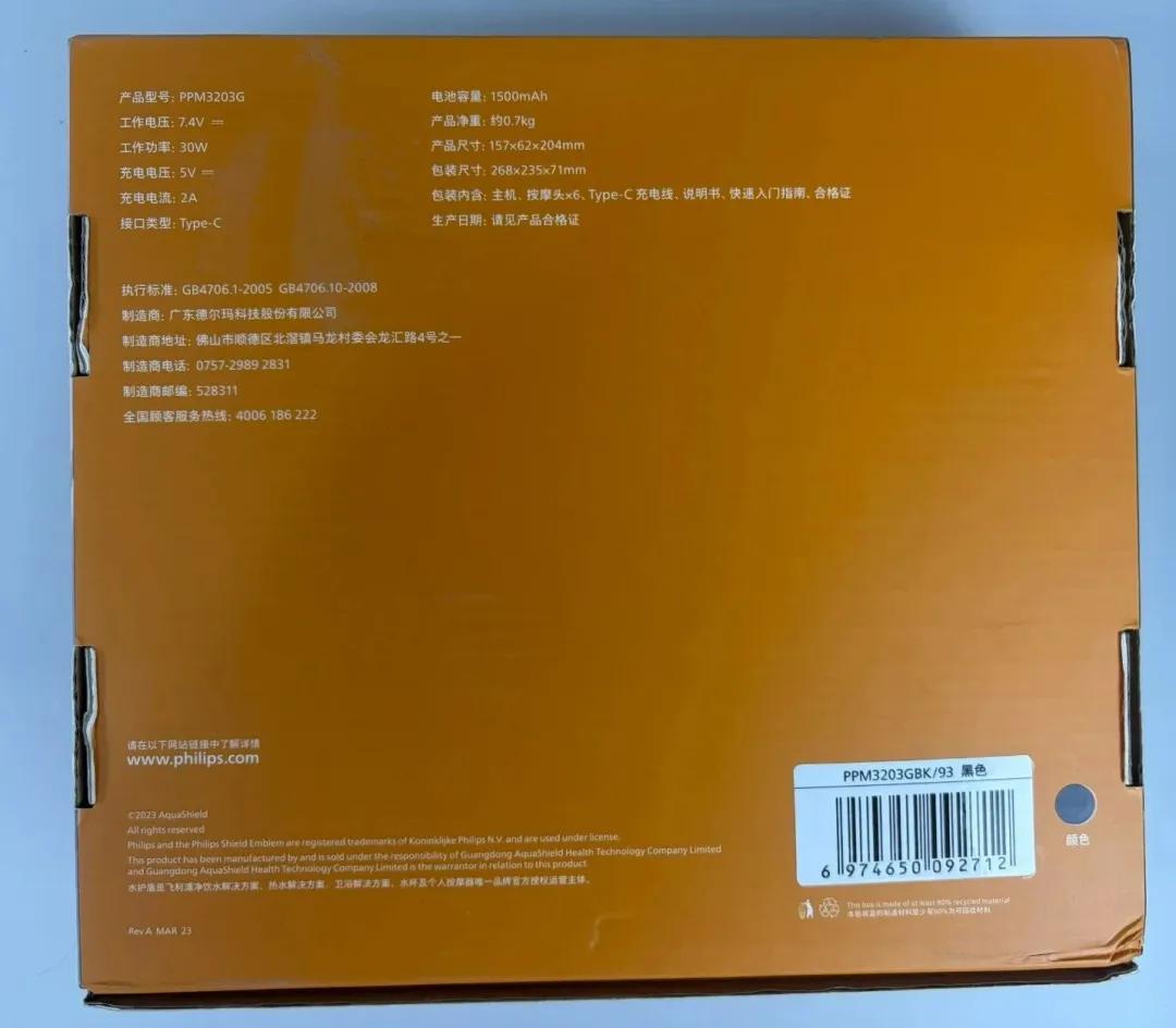包装盒特写,背面有这款飞利浦筋膜枪的一些规格参数以及其余相关信息。