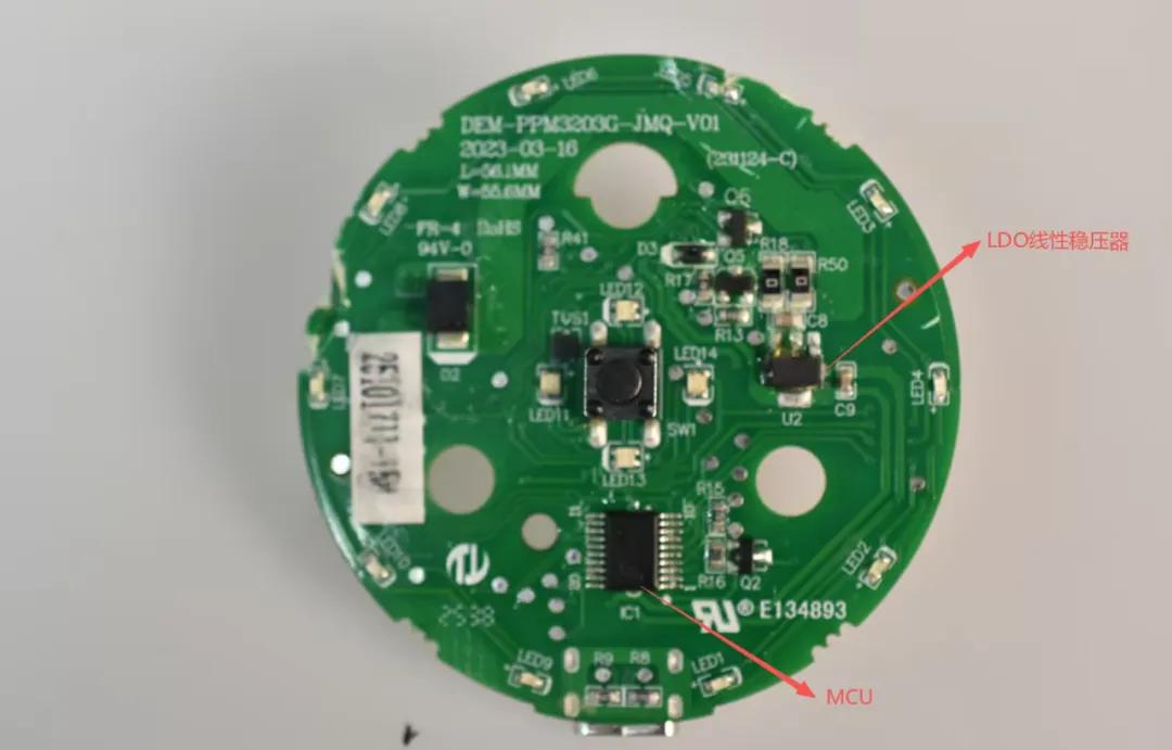 先看与电机相连的电路板。这块电路板上主要有以下元器件:1颗电控MCU芯片、1颗MOSFET、1颗LDO线性稳压器、1颗电容以及1颗栅极驱动IC。