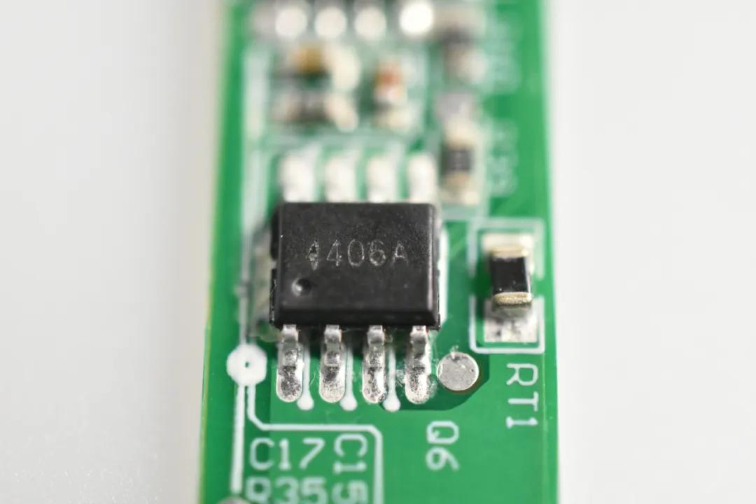 MOSFET均来自万国半导体,1颗与另一块电路板上的MOSFET是同一型号——AO4406A。另1颗MOSFET的型号则为AO4407L,封装形式为SOIC-8。