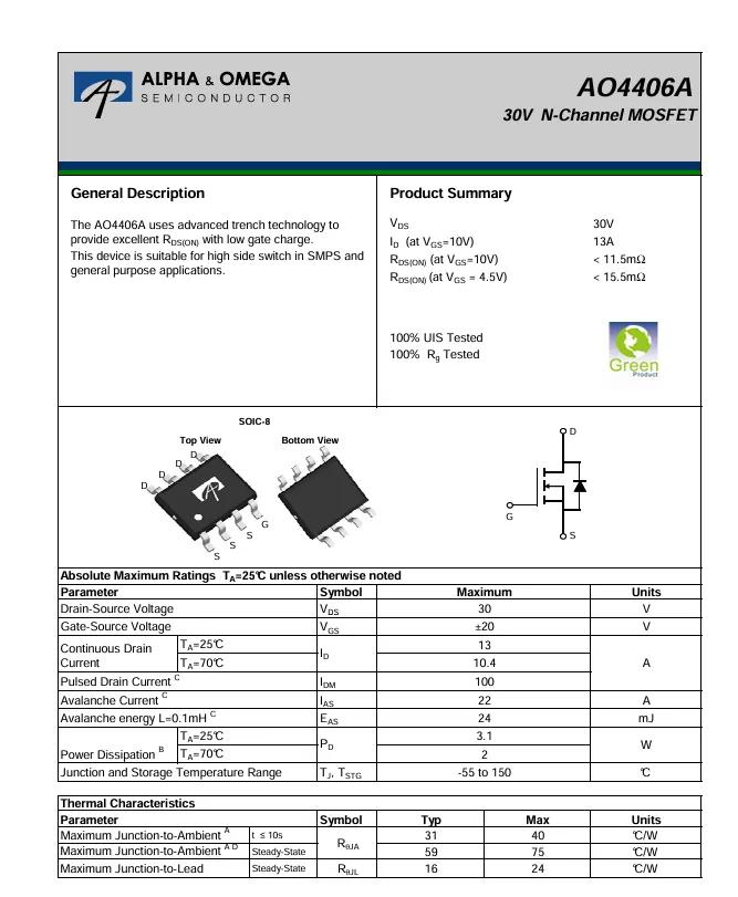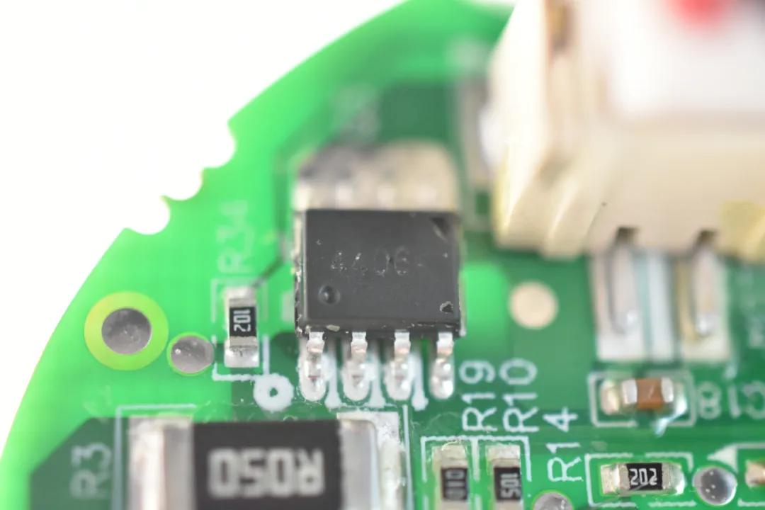 MOSFET选用来自万国半导体的AO4406A,封装形式为SOIC-8。 MOSFET作为核心功率开关,执行MCU的PWM指令,精准控制电机电流。