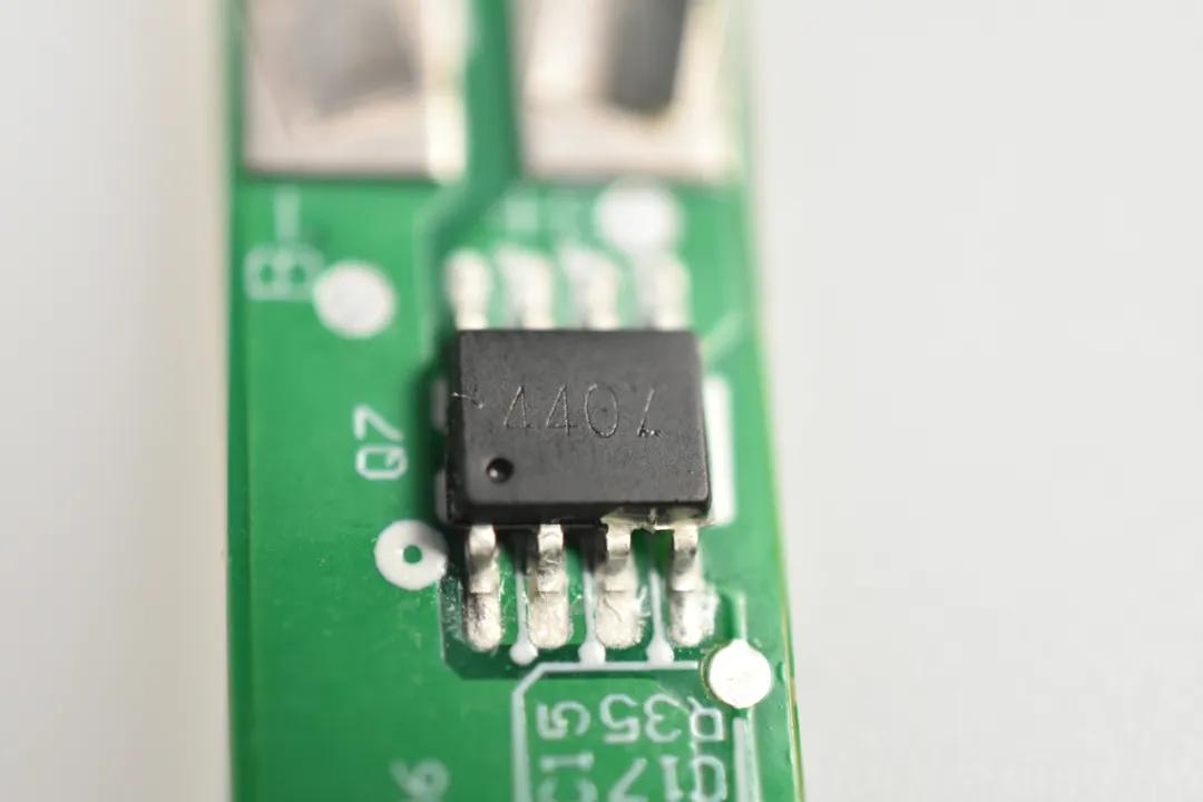 接下来是锂电保护板,电路板上有主要是以下元器件:1颗锂电保护IC,2颗MOSFET。