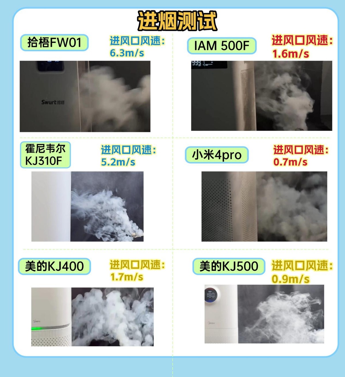 IAM 500、美的KJ500和小米这类机型在实际测试中进烟缓慢,烟雾在机体周边扩散时间较长,未能及时吸入净化。若应用于抽烟频繁或空气污染快速积聚的场景,响应会偏慢,可能难以满足用户快速除烟的需求。