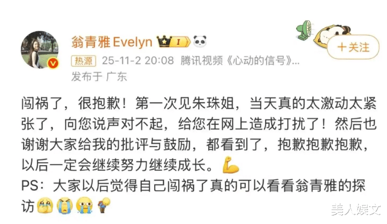 随着舆论的持续发酵,翁青雅终于意识到了事态的严重性,于 11 月 2 日在社交平台上发表了道歉声明 。她在文中写道:“闯祸了,很抱歉!第一次见朱珠姐,当天真的太激动太紧张了,向您说声对不起,给您在网上造成打扰了!然后也谢谢大家给我的批评与鼓励,都看到了,抱歉抱歉抱歉,以后一定会继续努力继续成长 。PS:大家以后觉得自己闯祸了真的可以看看翁青雅的探访。” 从道歉内容来看,她将采访中的种种失误归咎于 “太激动太紧张”,试图以此来获取大家的谅解。