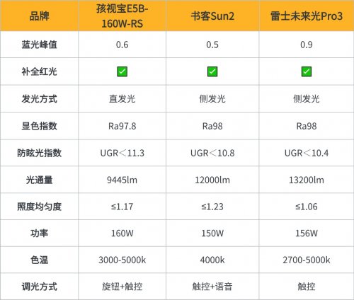 二、核心参数汇总为了让大家直观看清三款产品的核心性能差距,我们整理了书客Sun2、雷士未来光Pro3、孩视宝E5B-160W-RS的关键护眼参数,涵盖蓝光控制、红光增益、防眩光、光通量等核心维度,方便快速对比差异,为选购提供参考。