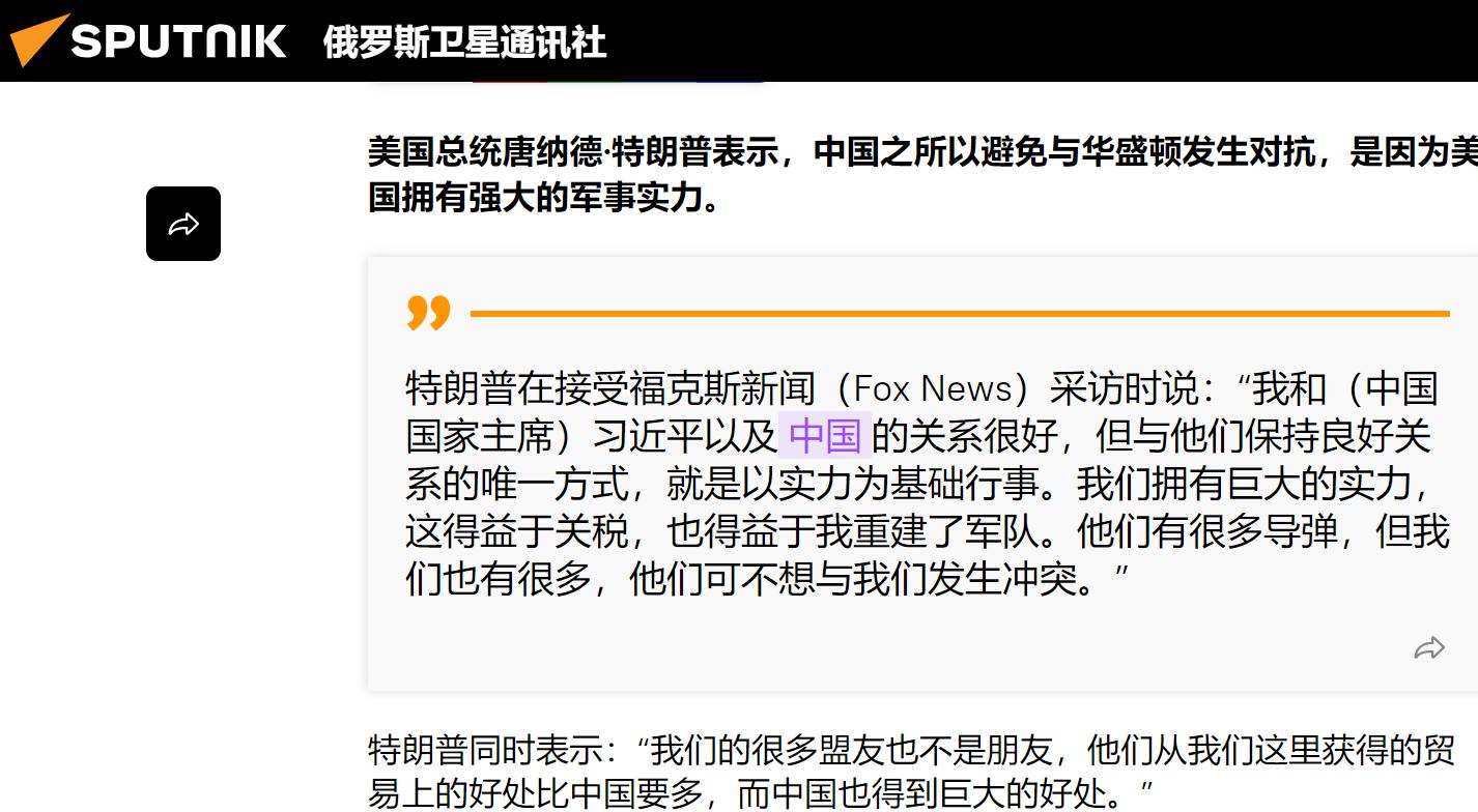 日前,特朗普在接受美媒采访时表示,他和中国的关系非常好,而中美保持良好关系的唯一方式,就是从实力出发打交道,中国之所以避免与美国爆发军事冲突,一是得益于关税,二是美国拥有强大的军事实力,让解放军不敢妄动。
